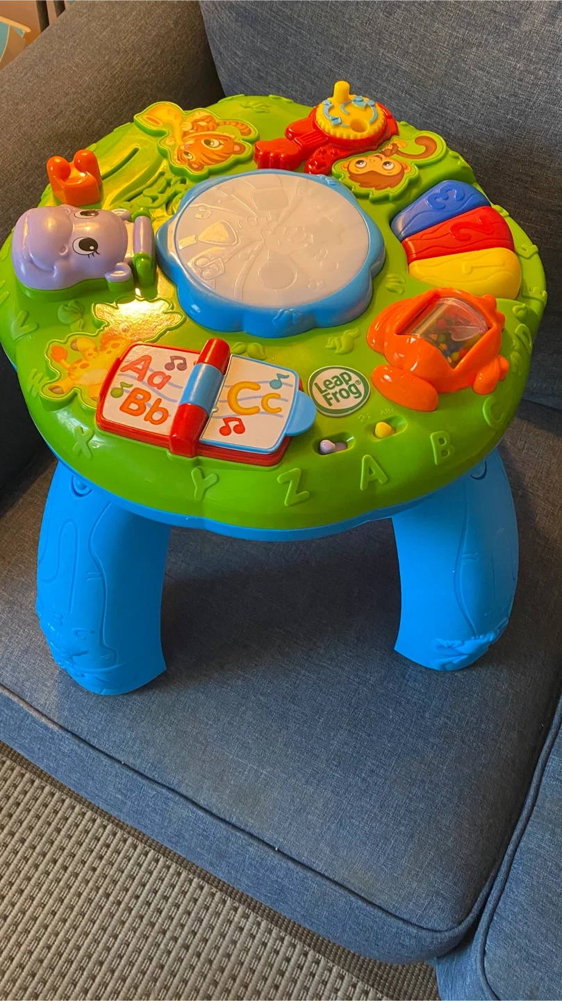 This activity table is loaded with fun! It has letters, numbers, and animal sounds. It's perfect for little ones to explore and learn through play. Legs are removable for floor play.