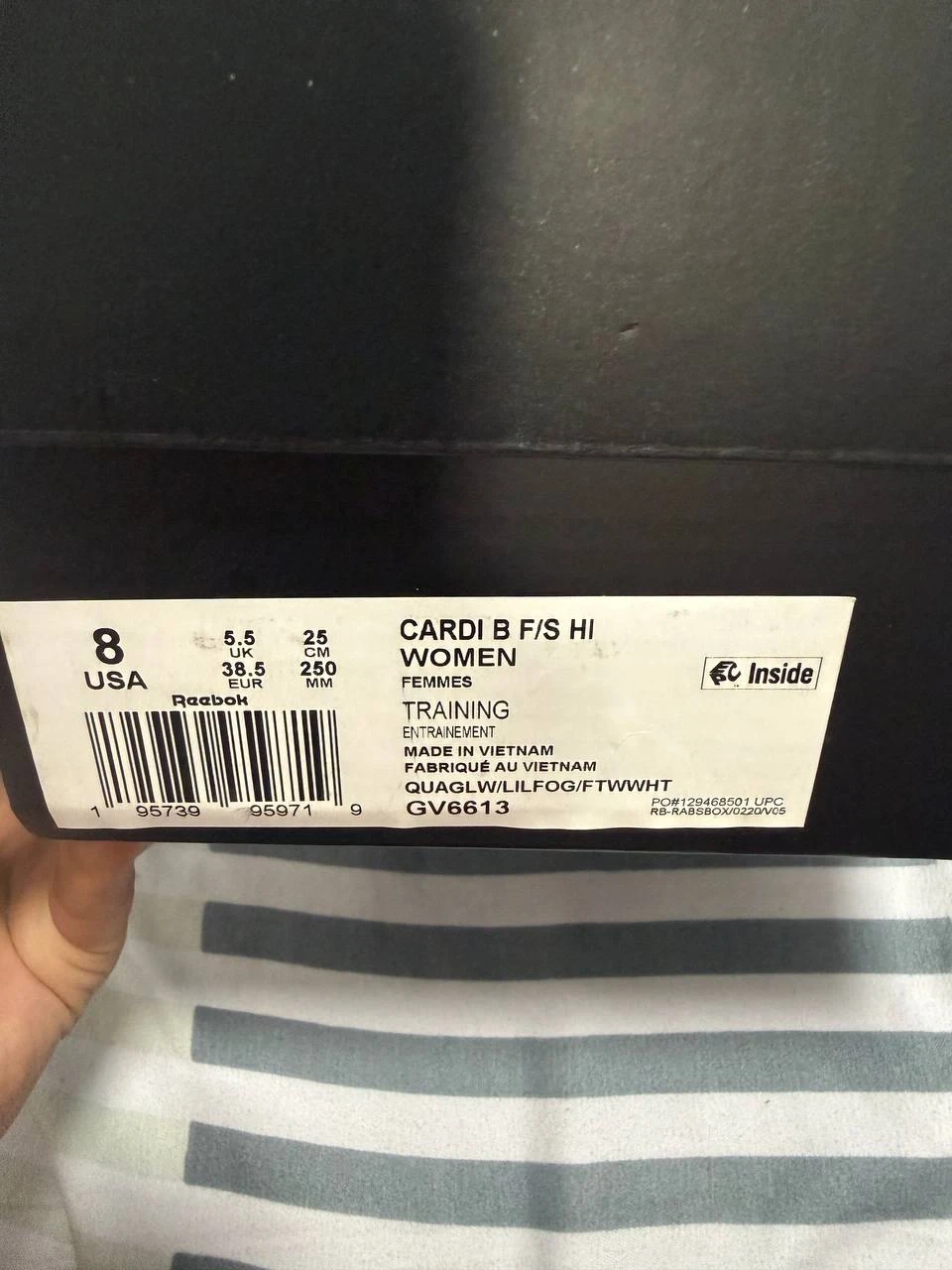 Selling a pair of Reebok Cardi B F/S Hi women's training shoes in size 8. These stylish high-top sneakers are perfect for training or casual wear. They come in a unique design and are in great condition! The shoes come with the original box.
