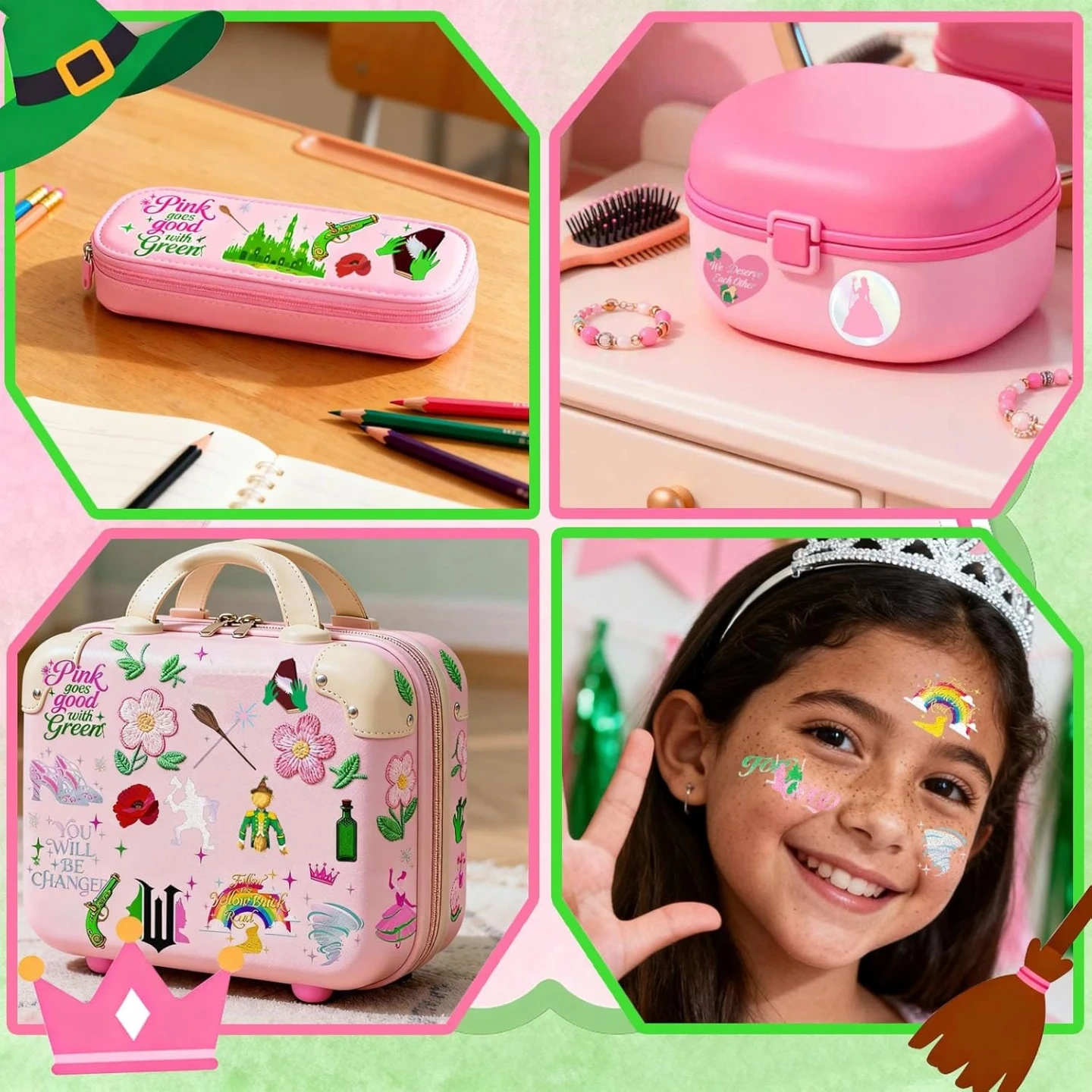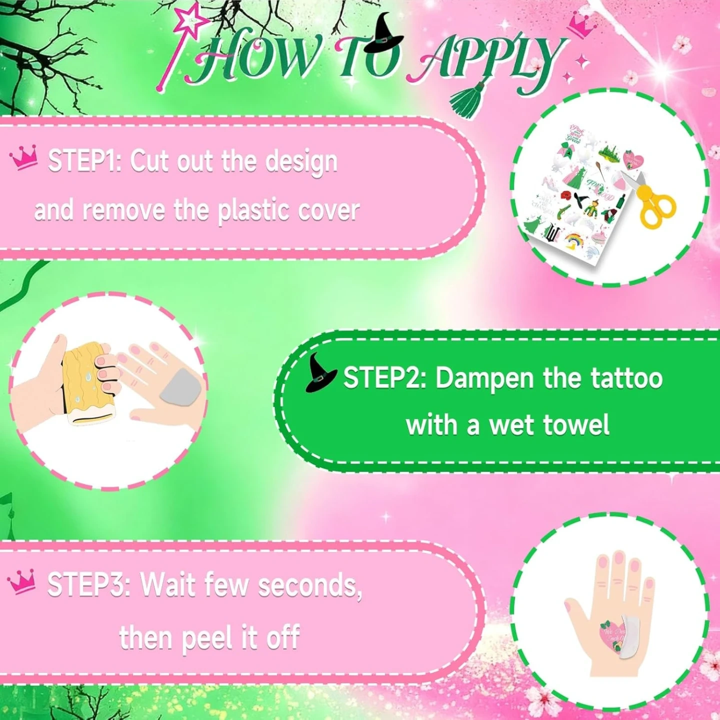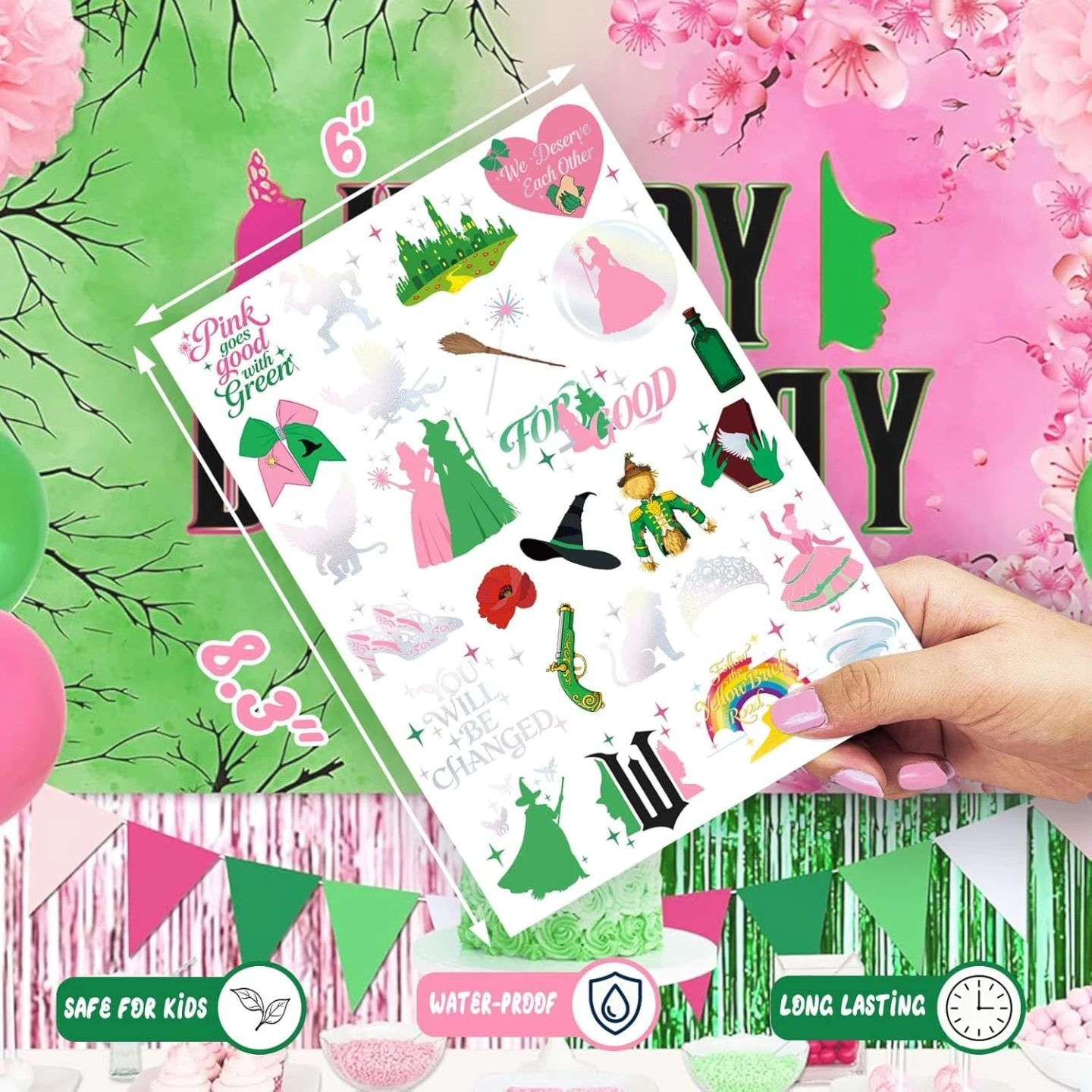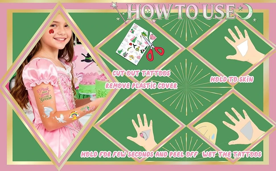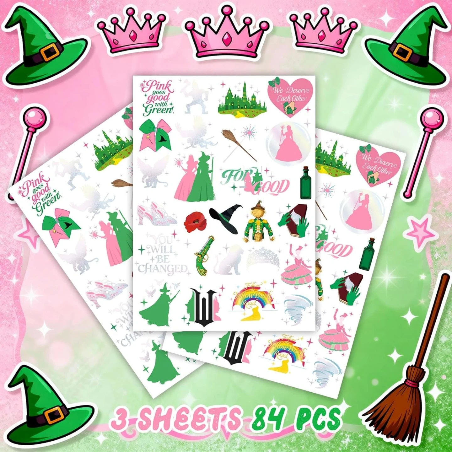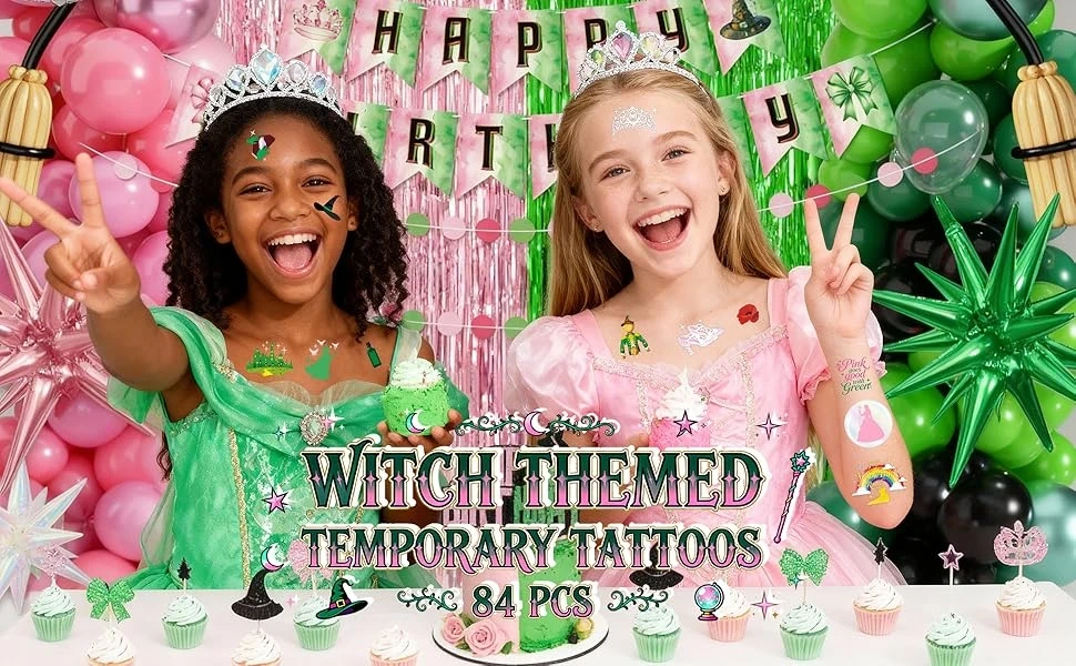 Witch Temporary Tattoos - Pink + Green 84 Pieces Foil Iridescent Design, For Good Wizard Party Favors, Birthday Witch Accessory, Kids Witch Themed Party Decorations, Party Favors
