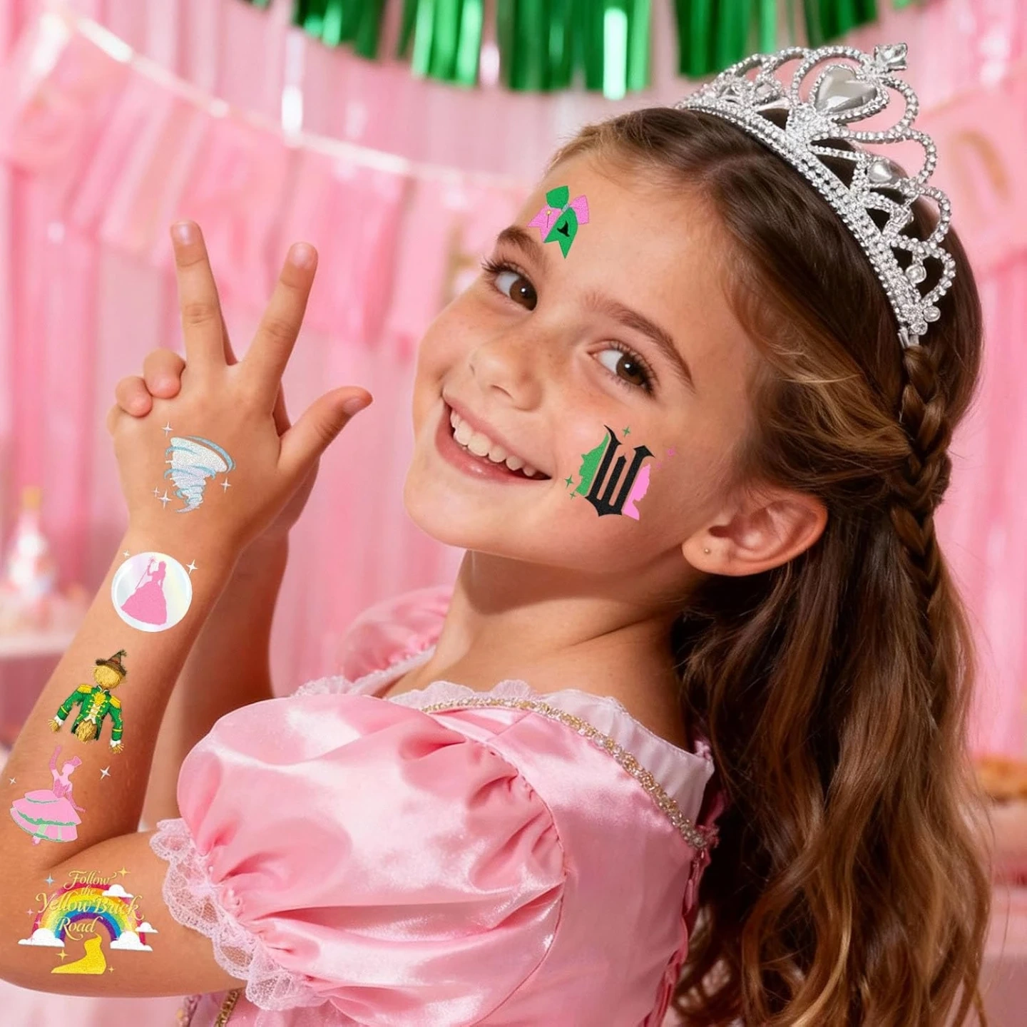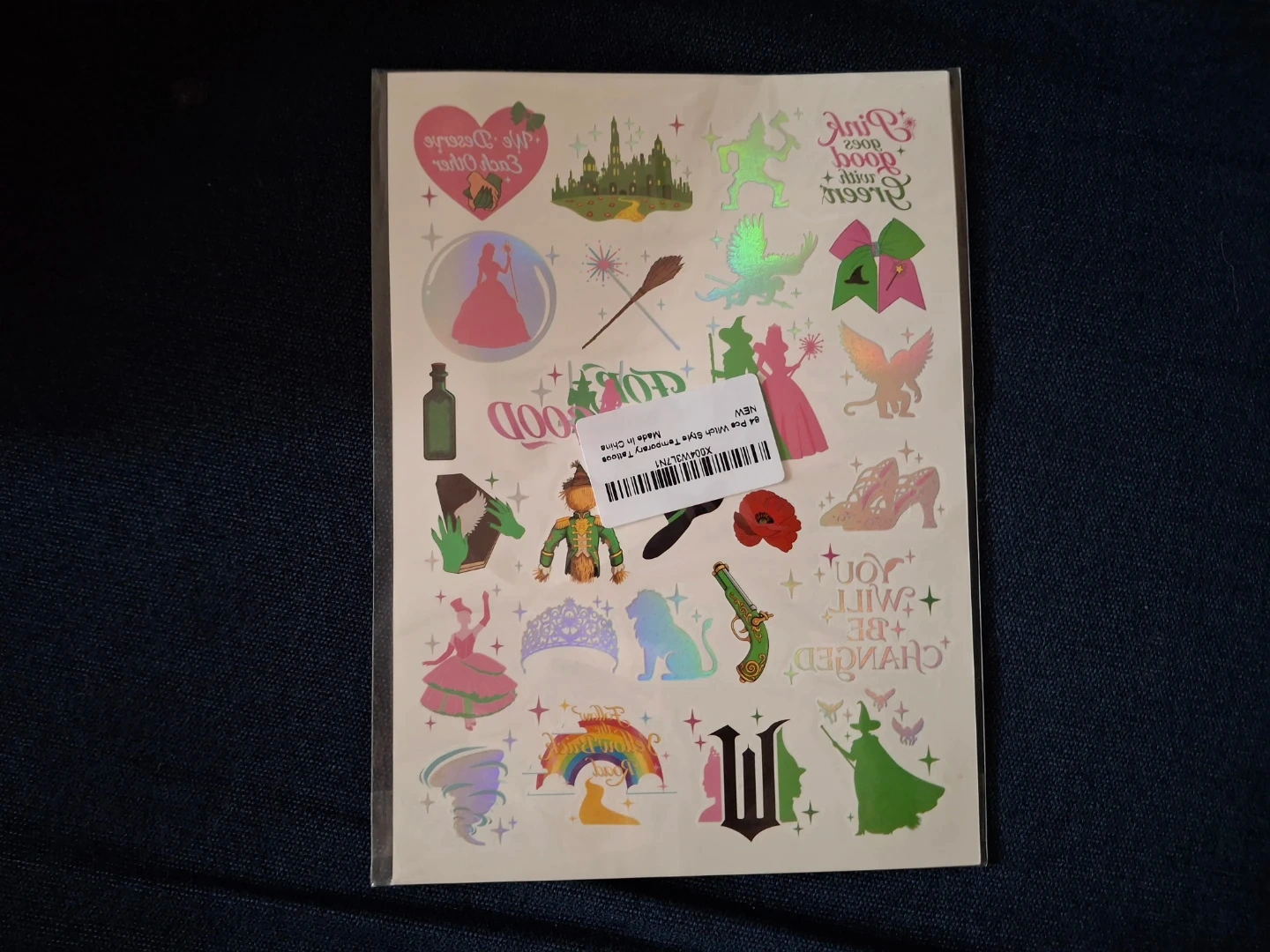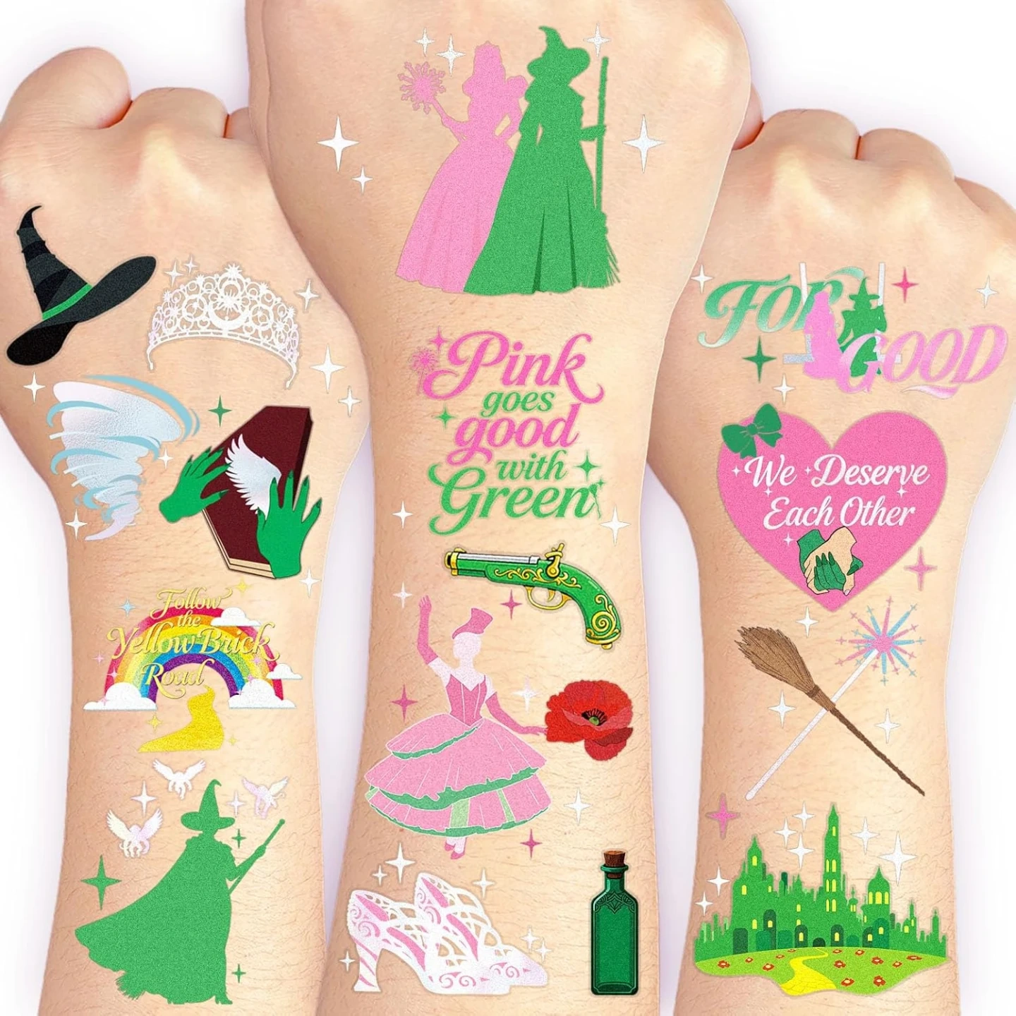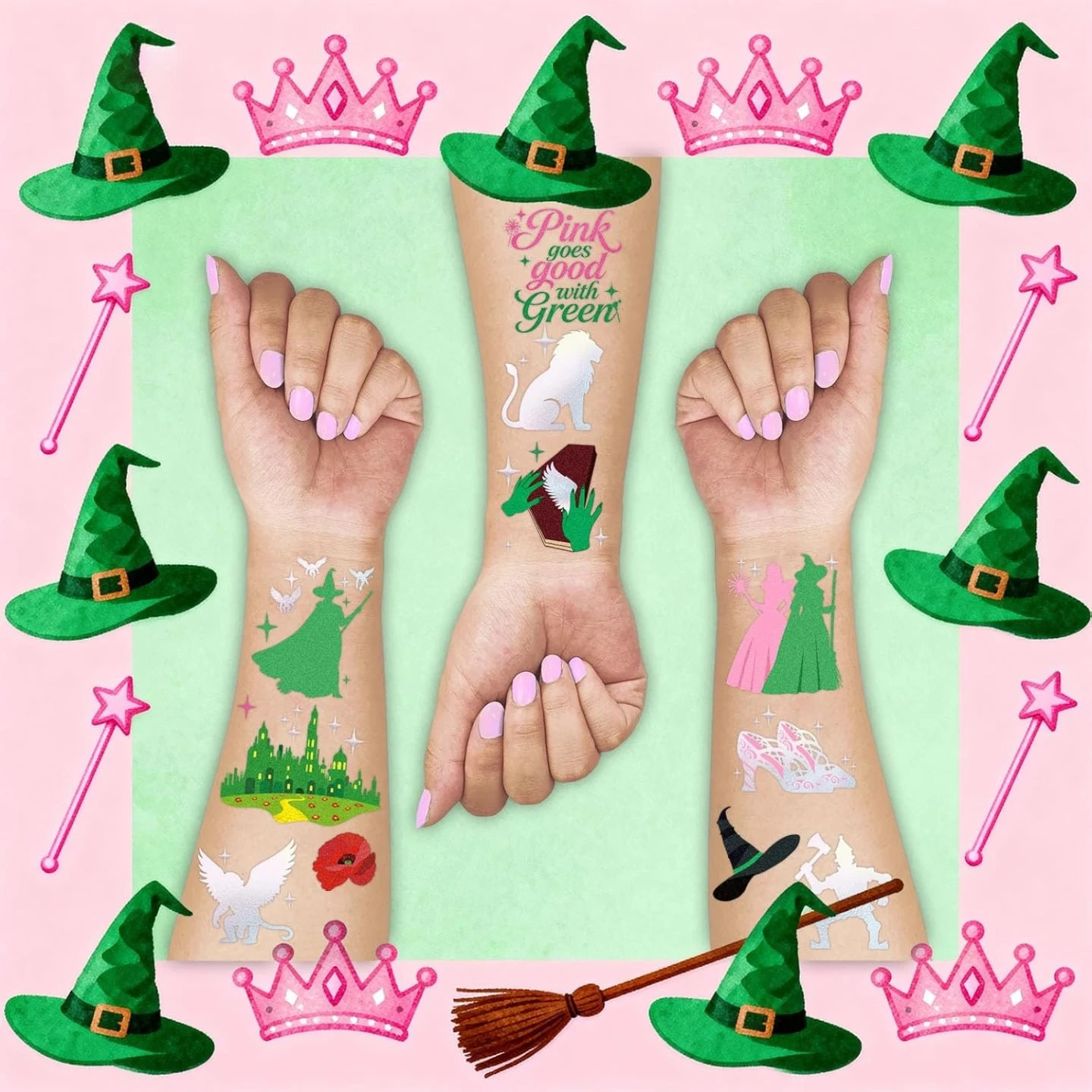3 Full Sheets (84 Tattoos Total!): Boast whimsical hand-drawn foil designs, including flying witches on broomsticks, yellow brick roads, Tin Man, Lion, Scarecrow and more unique motifs.