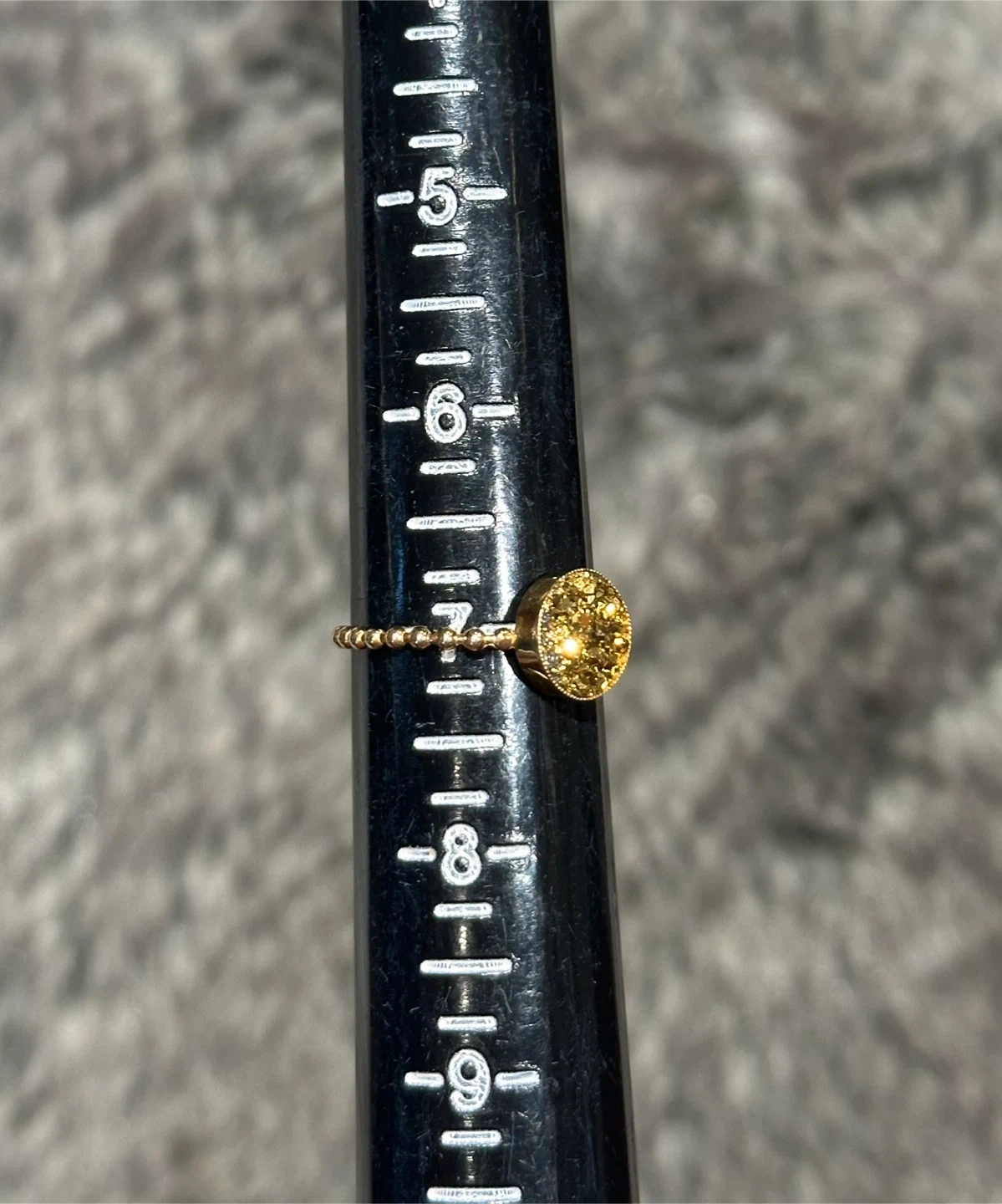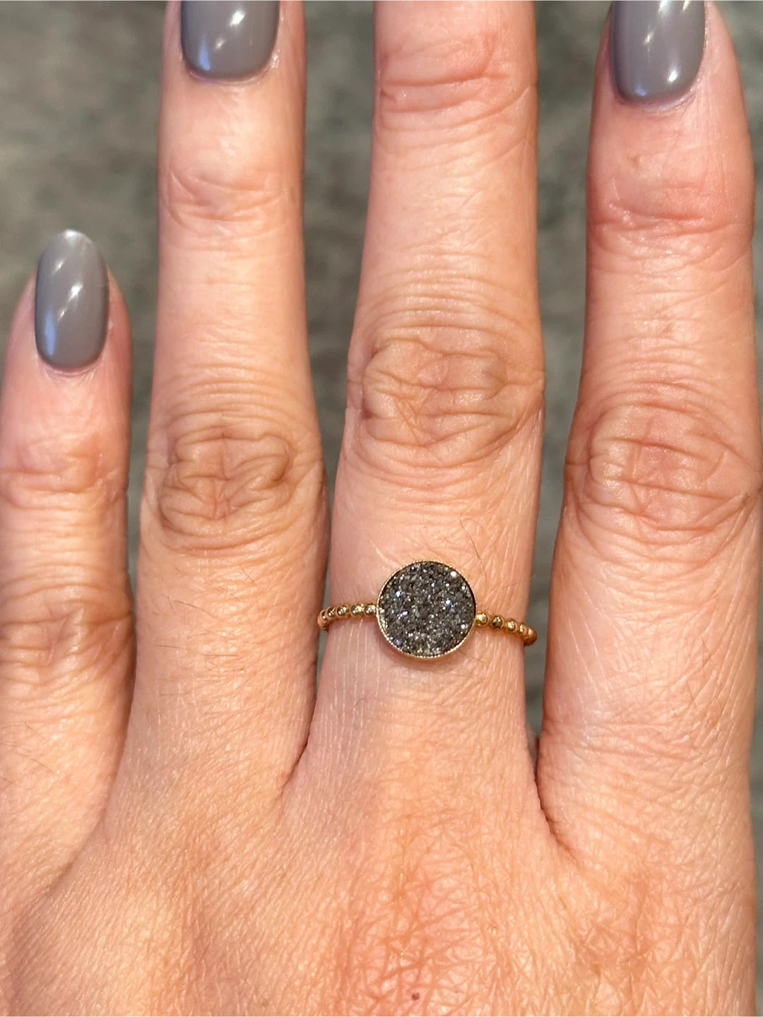 This is a beautiful solid 14k gold ring featuring a druzy stone. It has a unique and eye-catching design that would make a great addition to any jewelry collection! It is marked 14k on the inside of the ring. Rings can be sold separately or together. Both rings for $140 or $80 per ring. Ring size 7 on the golden drusy stone, and nearly 7.25 on the charcoal color stone