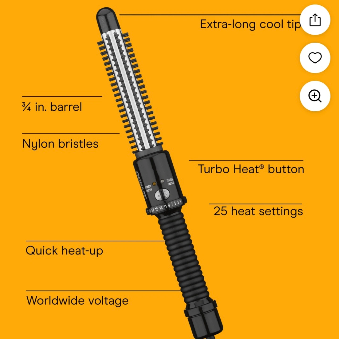 This 3/4 inch curling iron features nylon bristles and an extra-long cool tip. It offers 25 heat settings with quick heat-up and worldwide voltage. The Turbo Heat button provides instant heat. It's great for creating curls and waves.