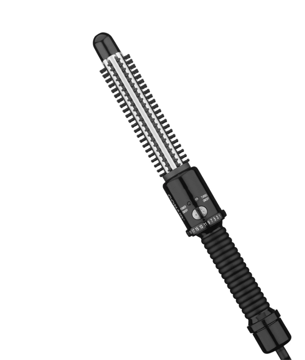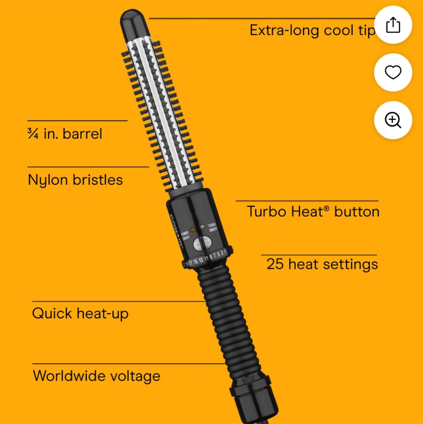 This 3/4 inch curling iron features nylon bristles and an extra-long cool tip. It offers 25 heat settings with quick heat-up and worldwide voltage. The Turbo Heat button provides instant heat. It's great for creating curls and waves.