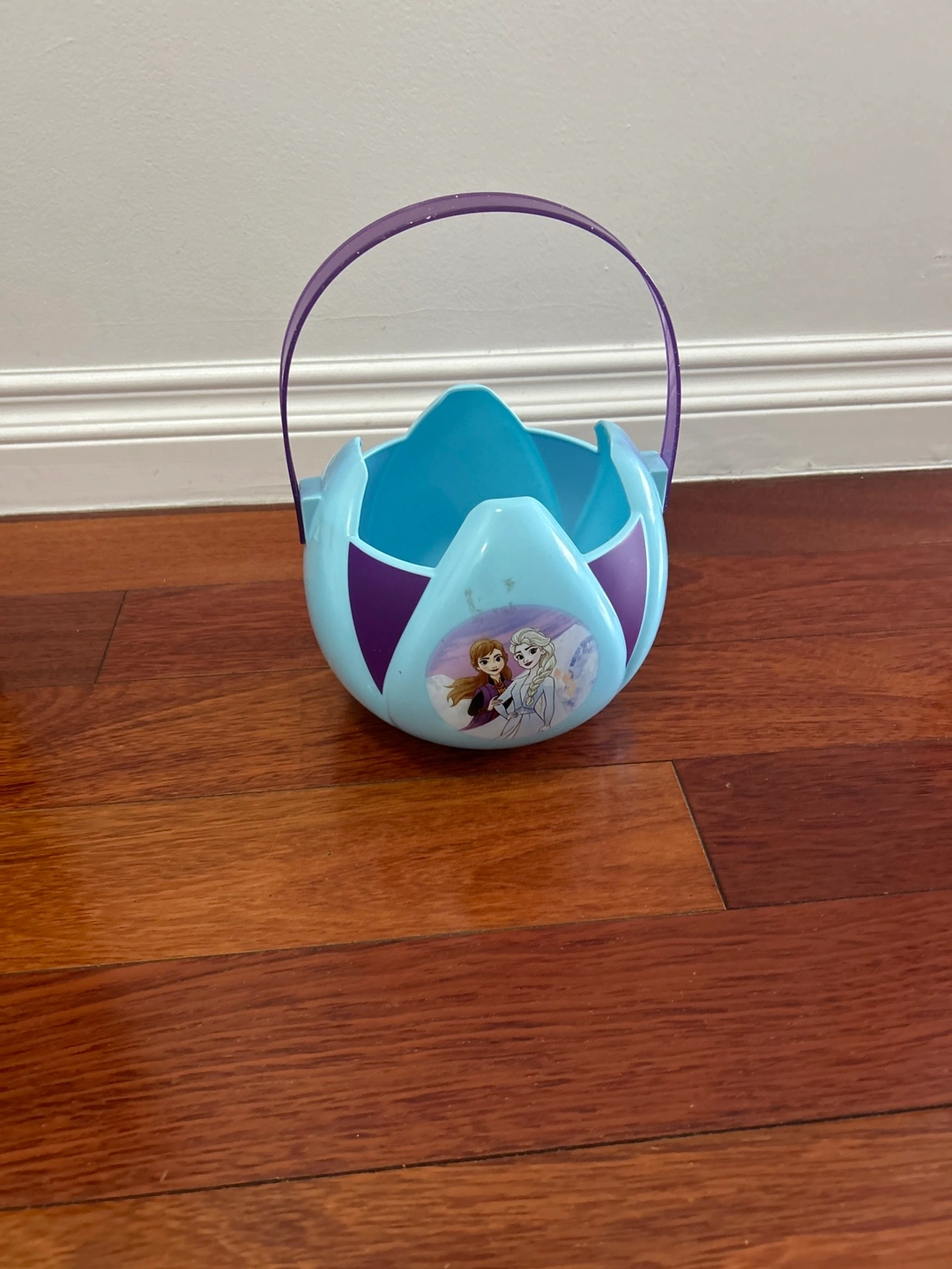 A blue and purple basket with a Frozen image on it. It has a purple handle. The bottom is also purple. It is in the shape of a flower.