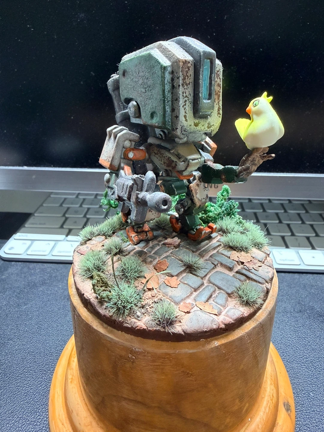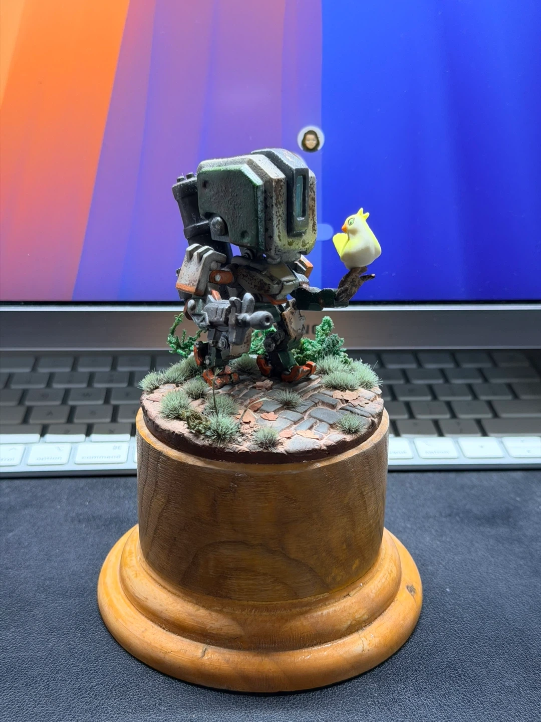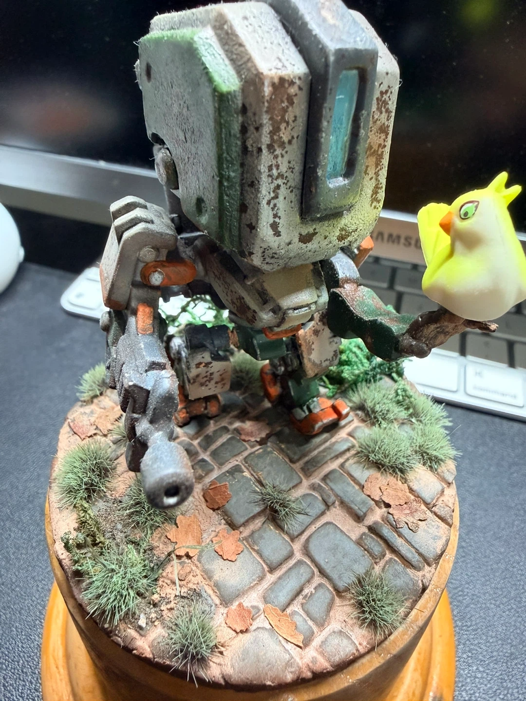 Hand-painted diorama featuring a miniature of Bastion with his bird companion, Ganymede. It's mounted on a wooden base with a cobblestone path and greenery. Perfect for any Overwatch fan's collection!