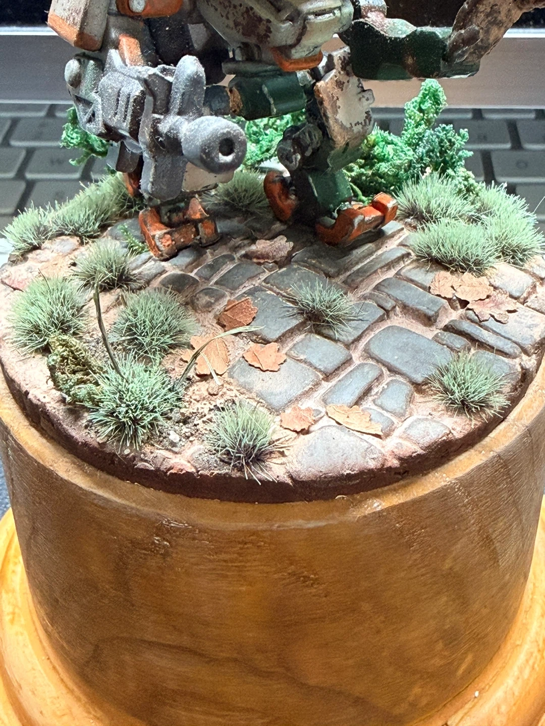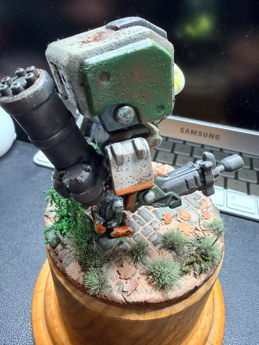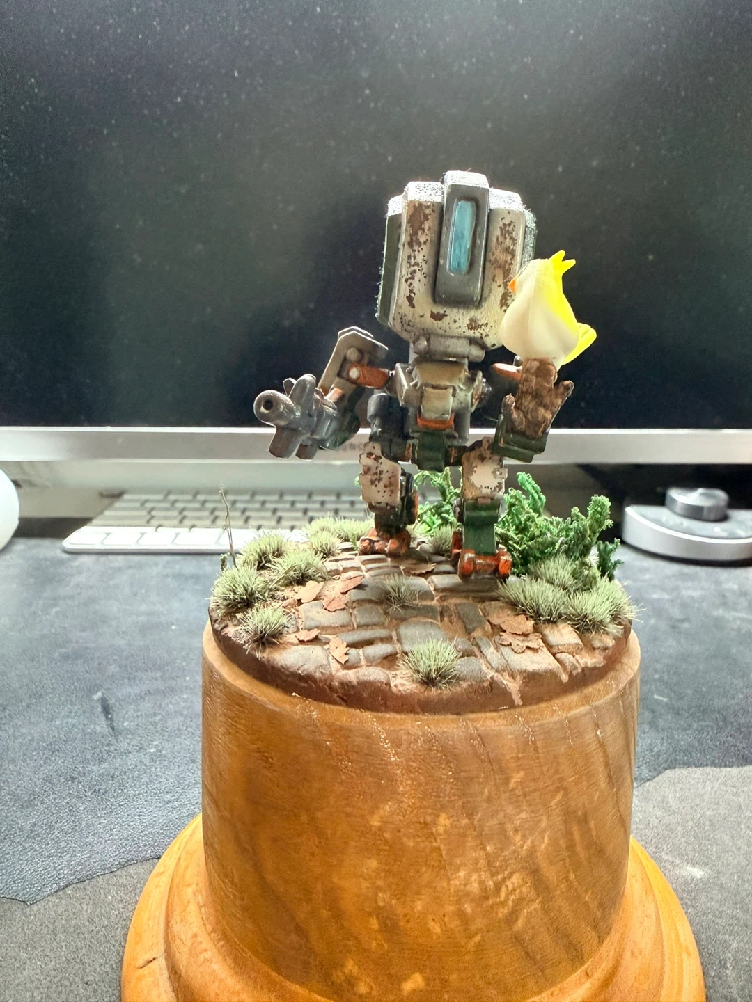 Hand-painted diorama featuring a miniature of Bastion with his bird companion, Ganymede. It's mounted on a wooden base with a cobblestone path and greenery. Perfect for any Overwatch fan's collection!