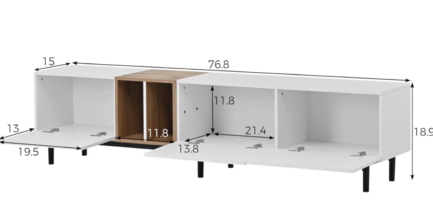 This modern media console features a white finish with a natural wood accent. It offers ample storage with cabinets and open shelving. Dimensions: 76.8" L x 18.9" H x 13.8" D. Perfect for organizing media equipment and decor!