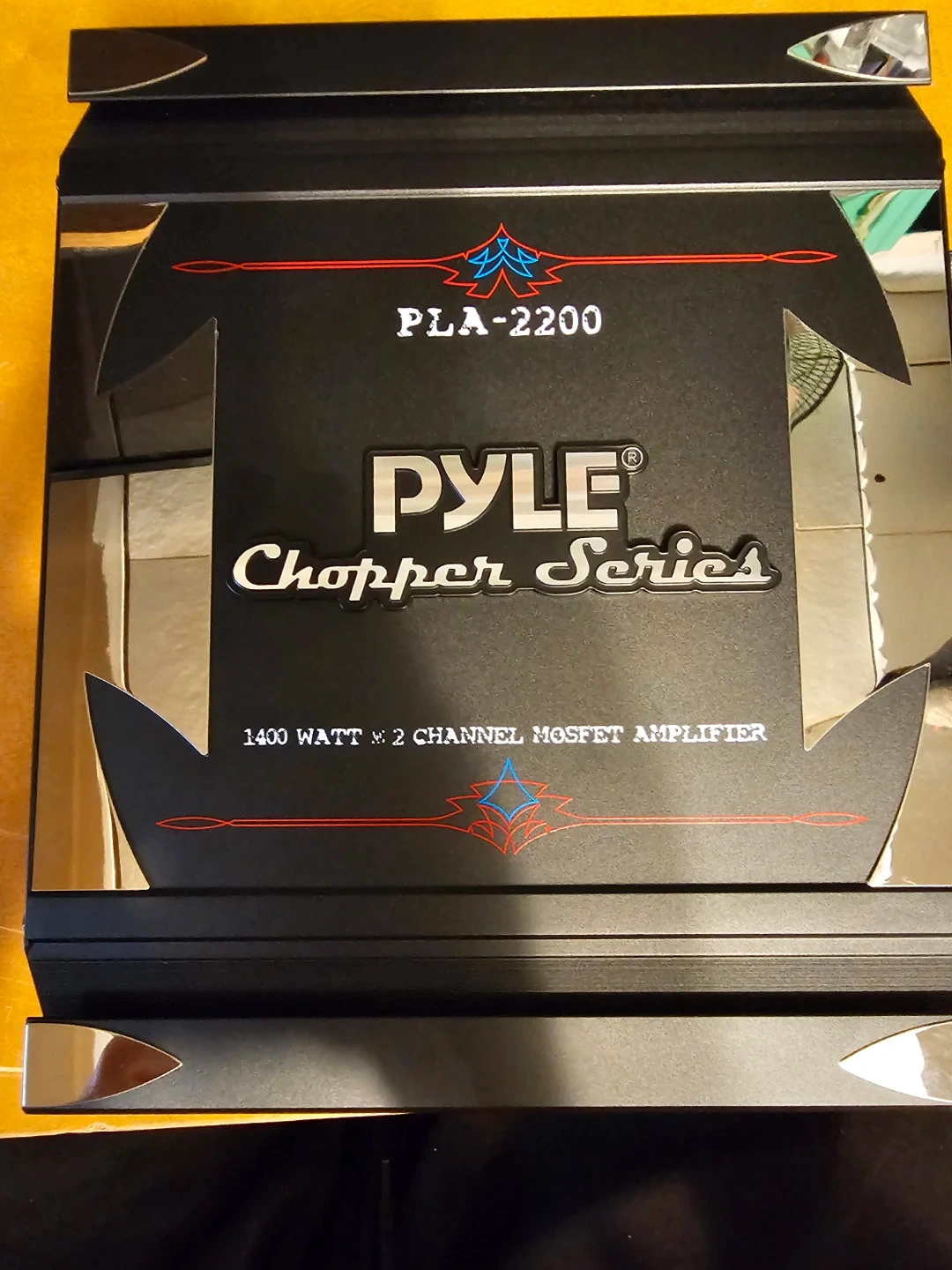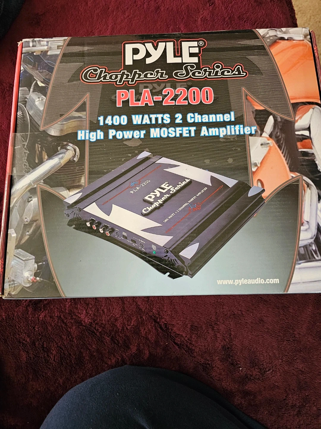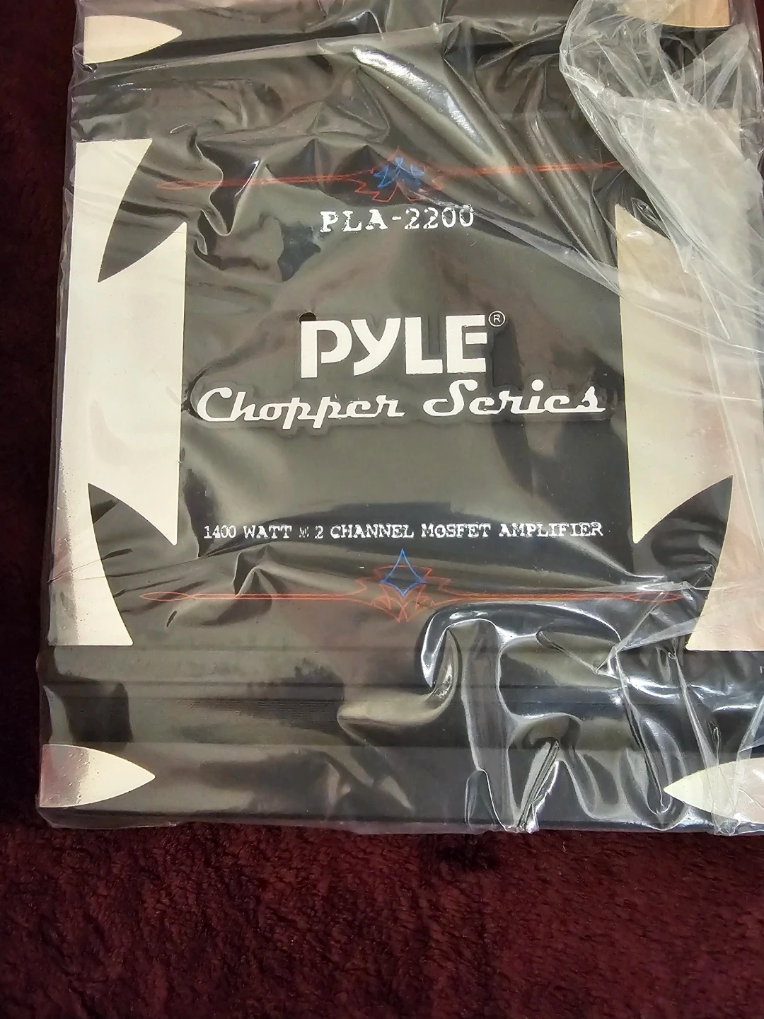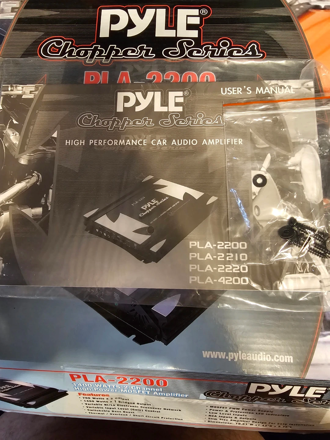 Pyle Chopper Series PLA-2200 amplifier. It's a 1400 watt, 2 channel MOSFET amplifier. Features include variable Hi/Lo electronic crossover network and switchable bass boost. MOSFET PWM power supply.