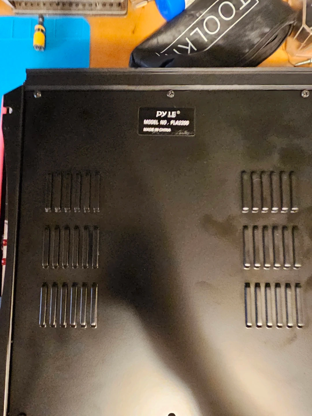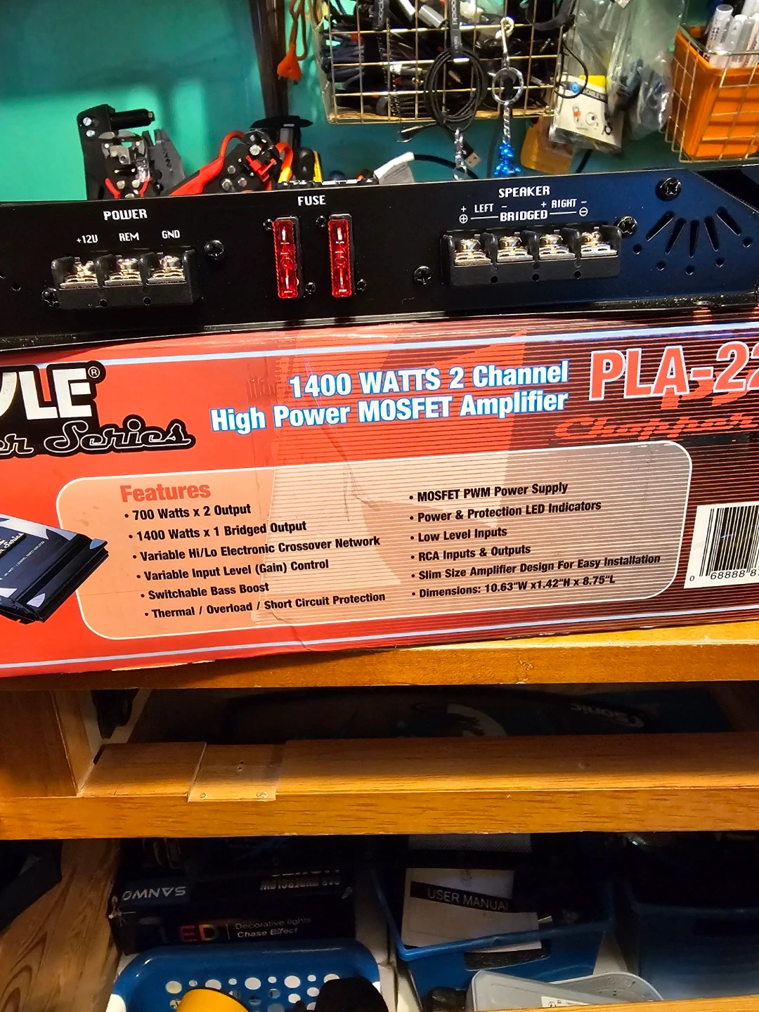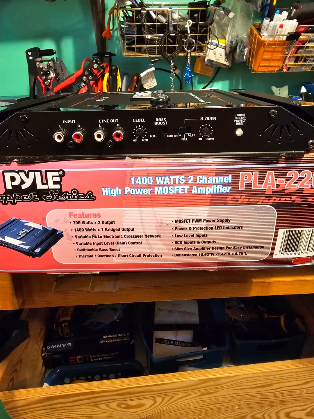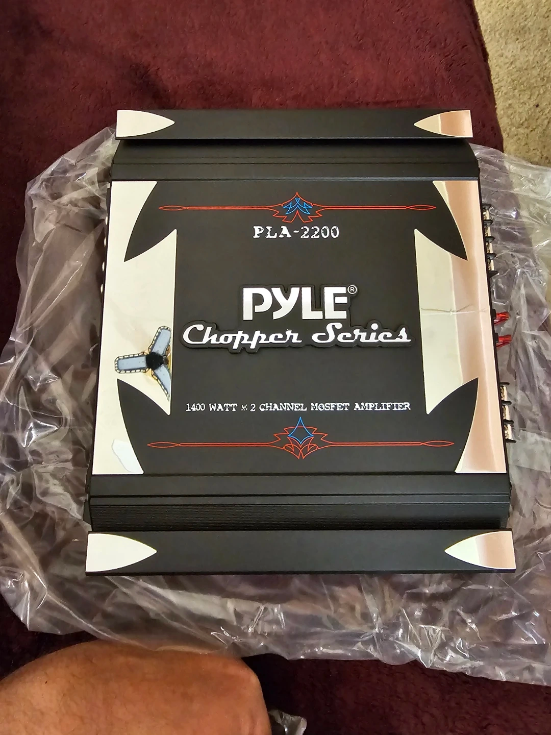Pyle Chopper Series PLA-2200 amplifier. It's a 1400 watt, 2 channel MOSFET amplifier. Features include variable Hi/Lo electronic crossover network and switchable bass boost. MOSFET PWM power supply.