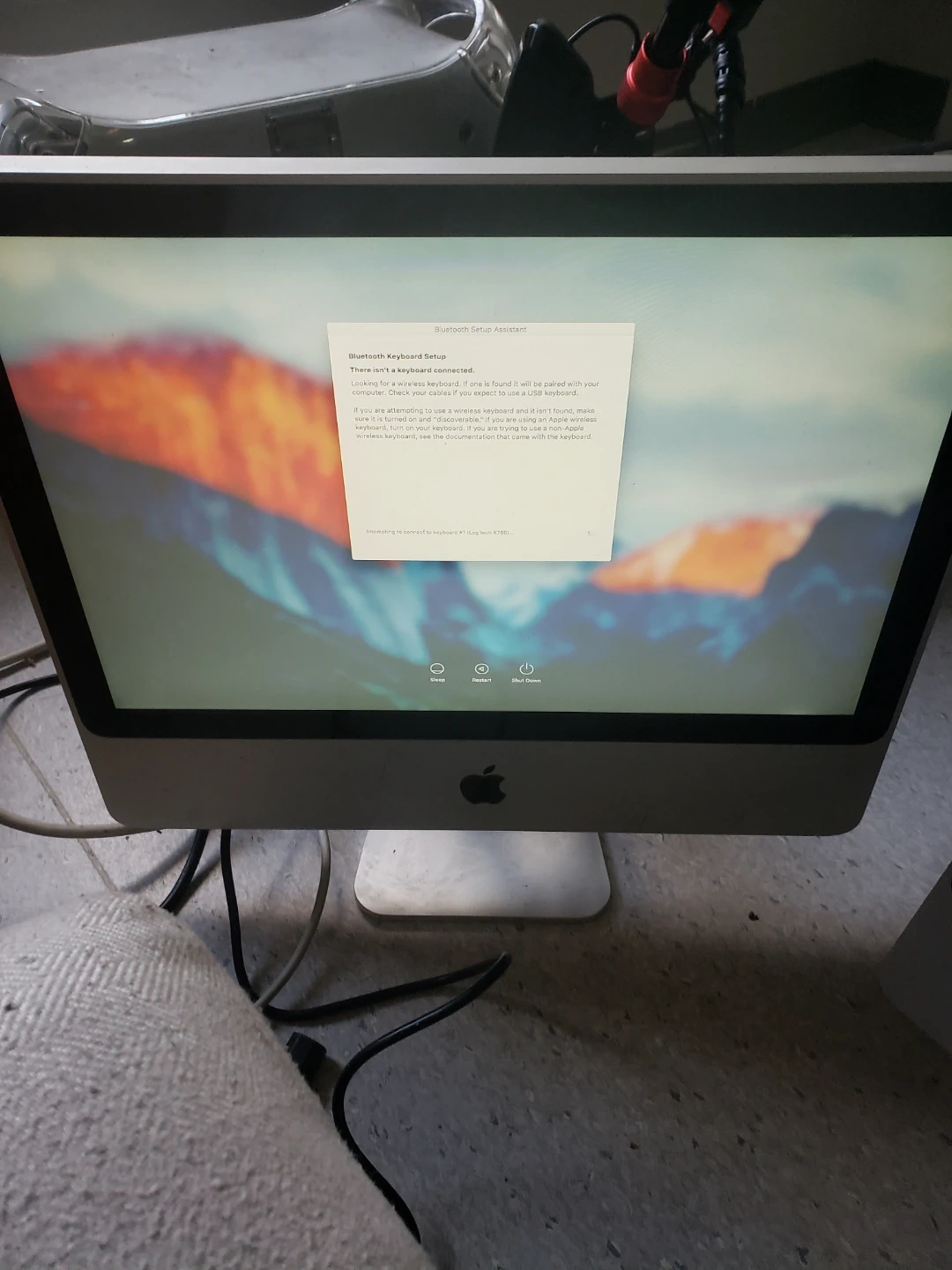 Selling an Apple iMac. The screen shows a 'Bluetooth Keyboard Setup' message indicating that there isn't a keyboard connected. It suggests checking cables or ensuring the keyboard is discoverable. If you're using a non-Apple wireless keyboard, refer to the documentation that came with it powers up and works