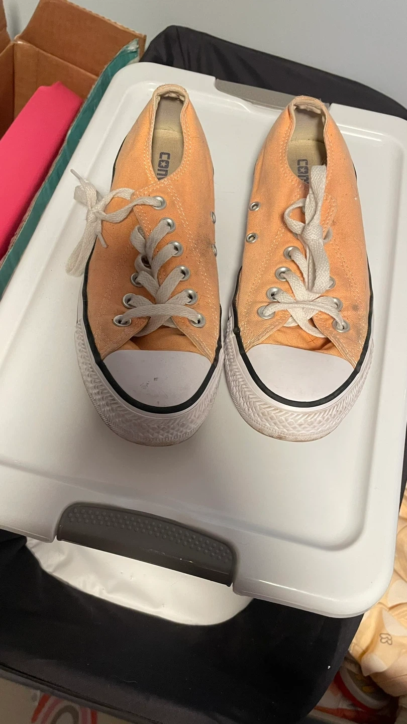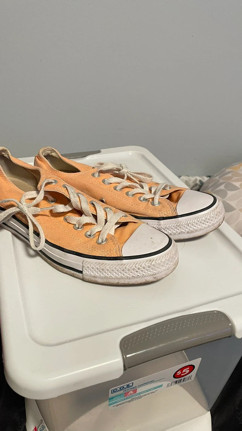 Classic Converse Chuck Taylor All Star low top sneakers in a peach color. Canvas upper with rubber sole. These are a casual staple for everyday wear!