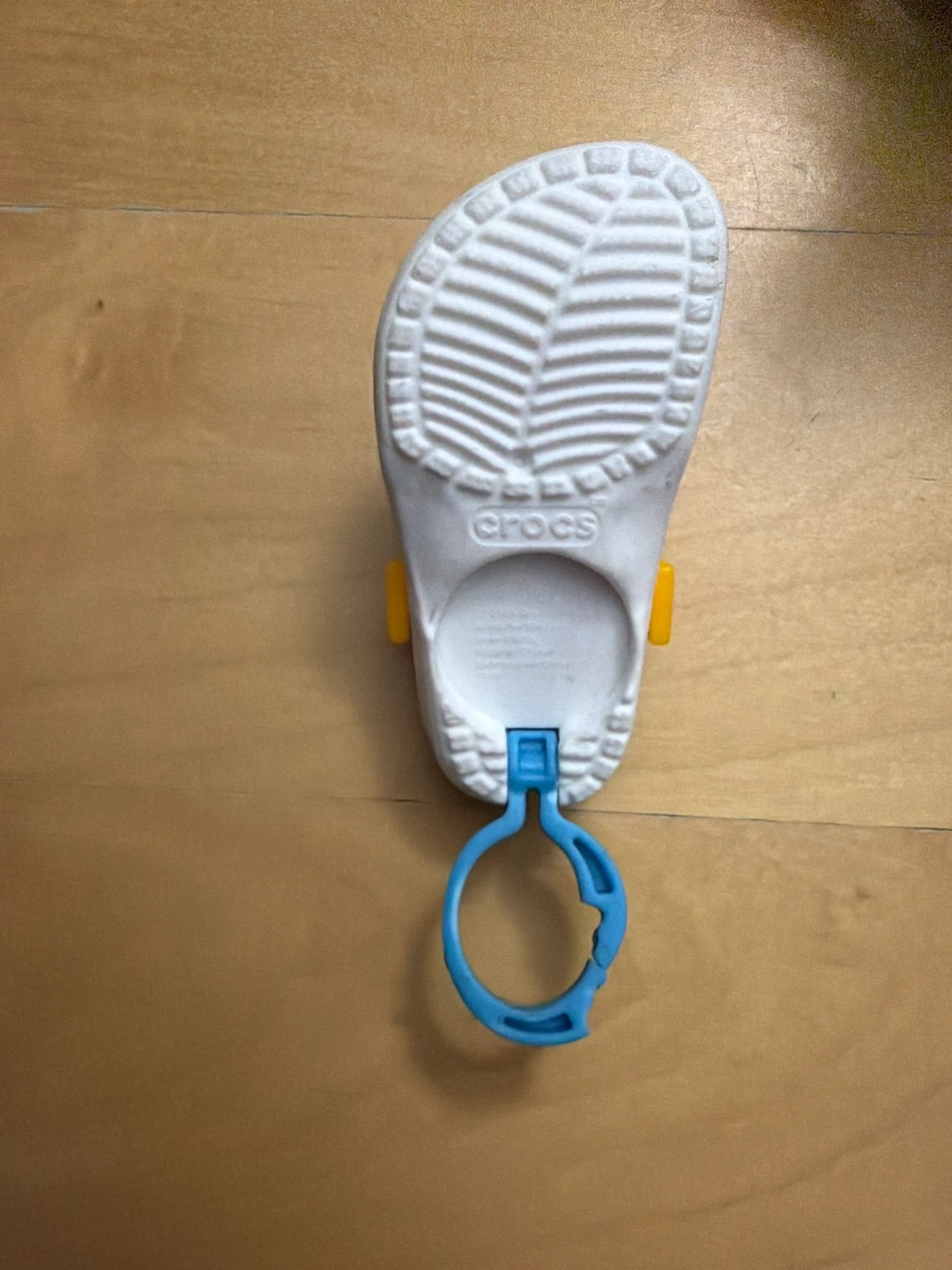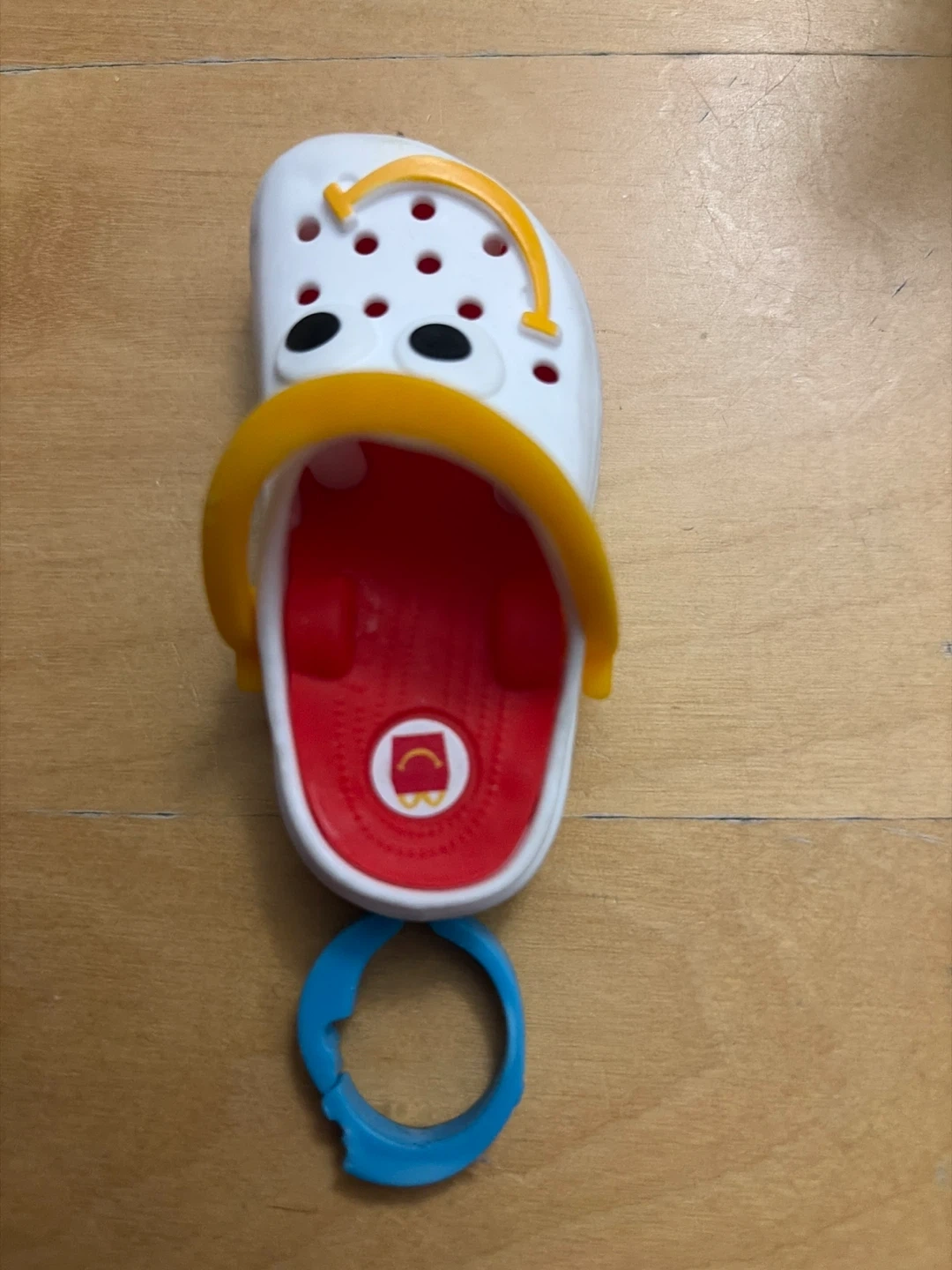 This is a white Crocs bag charm from McDonald’s. It has yellow and orange accents. Includes a blue loop attachment.