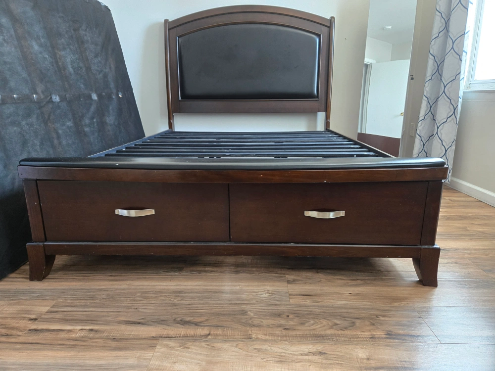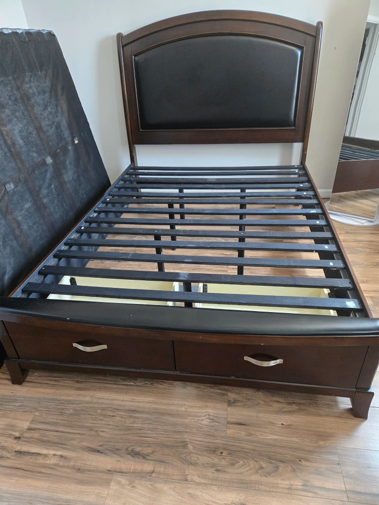 **Closing Sales** Selling a bed frame with a dark wood finish and a black upholstered headboard. Comes with the slim box. All accessories available.