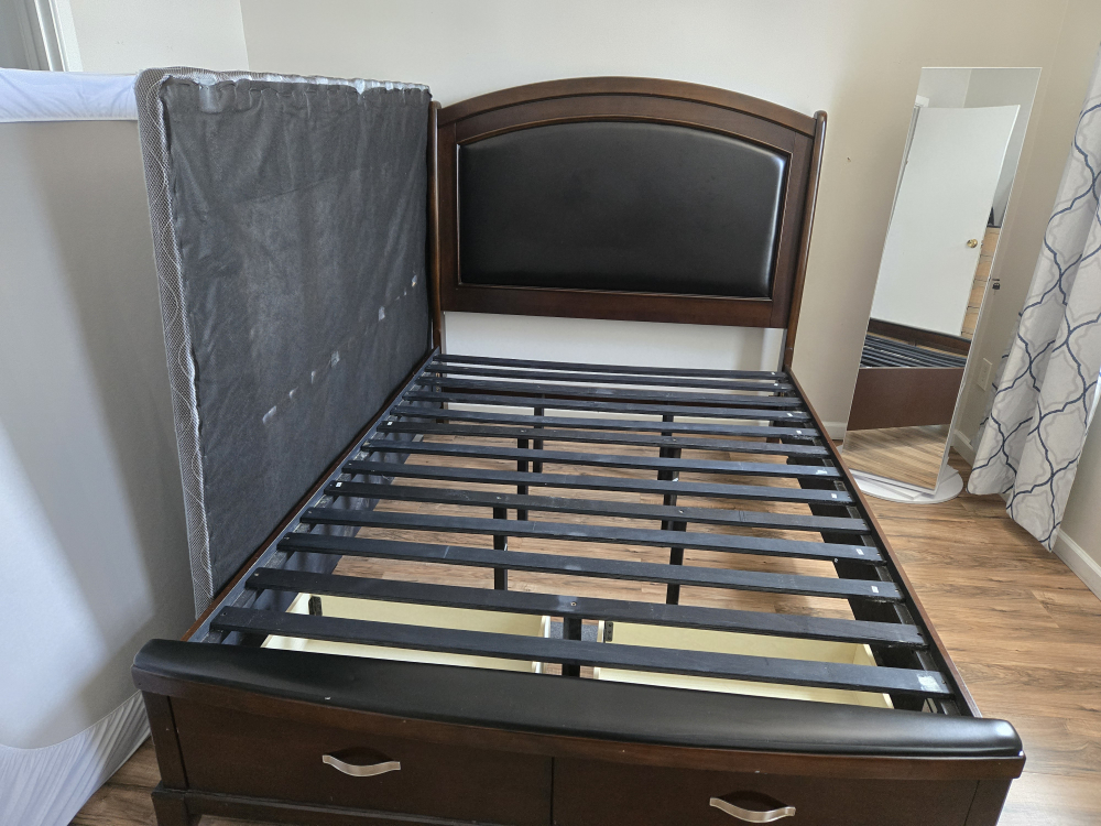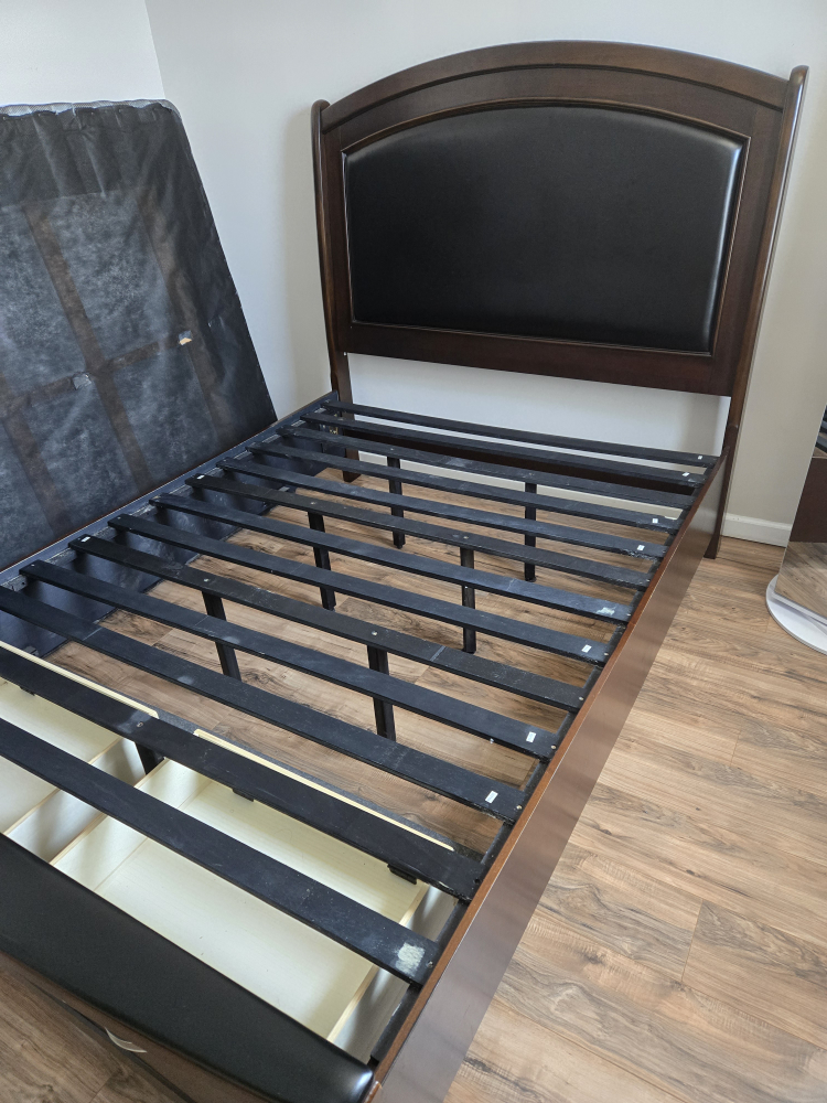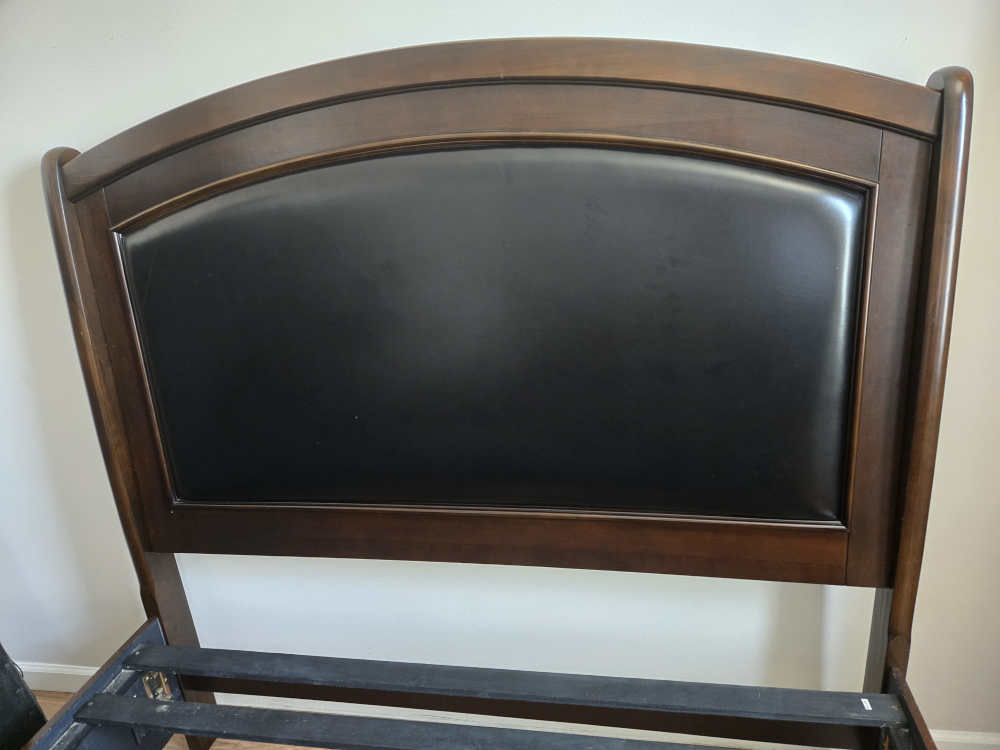 **Closing Sales** Selling a bed frame with a dark wood finish and a black upholstered headboard. Comes with the slim box. All accessories available.