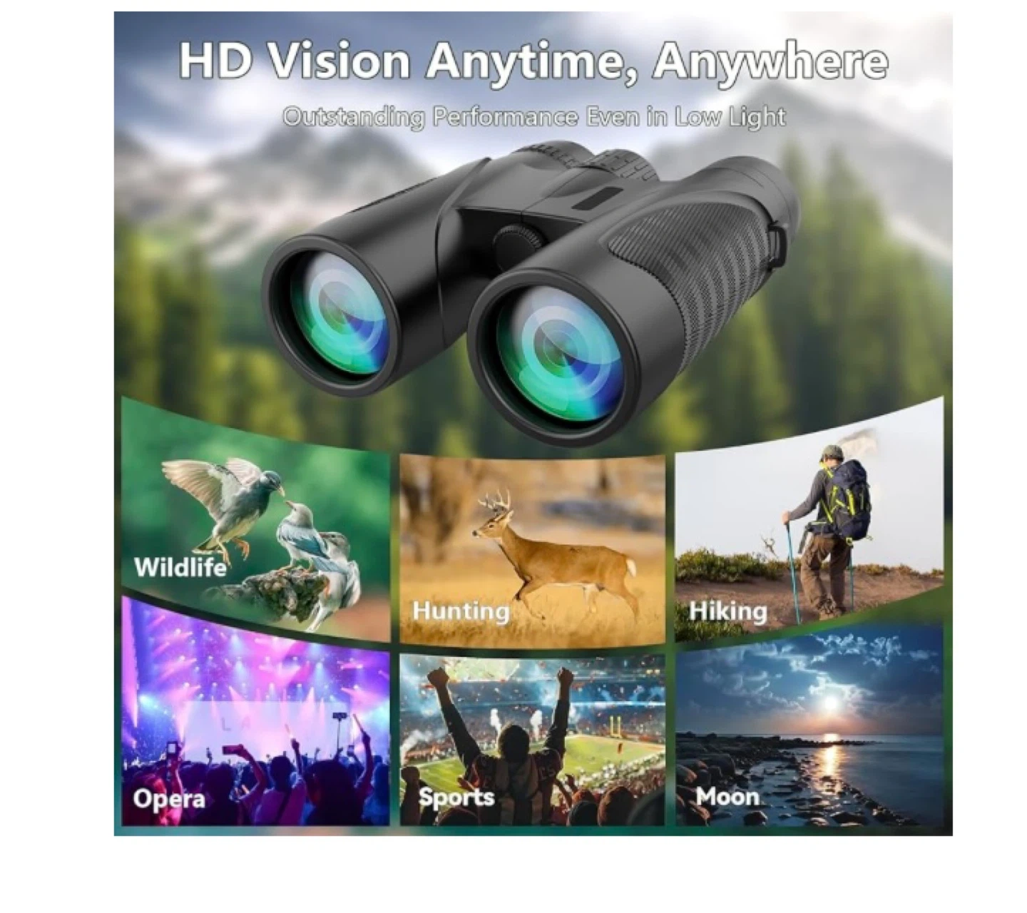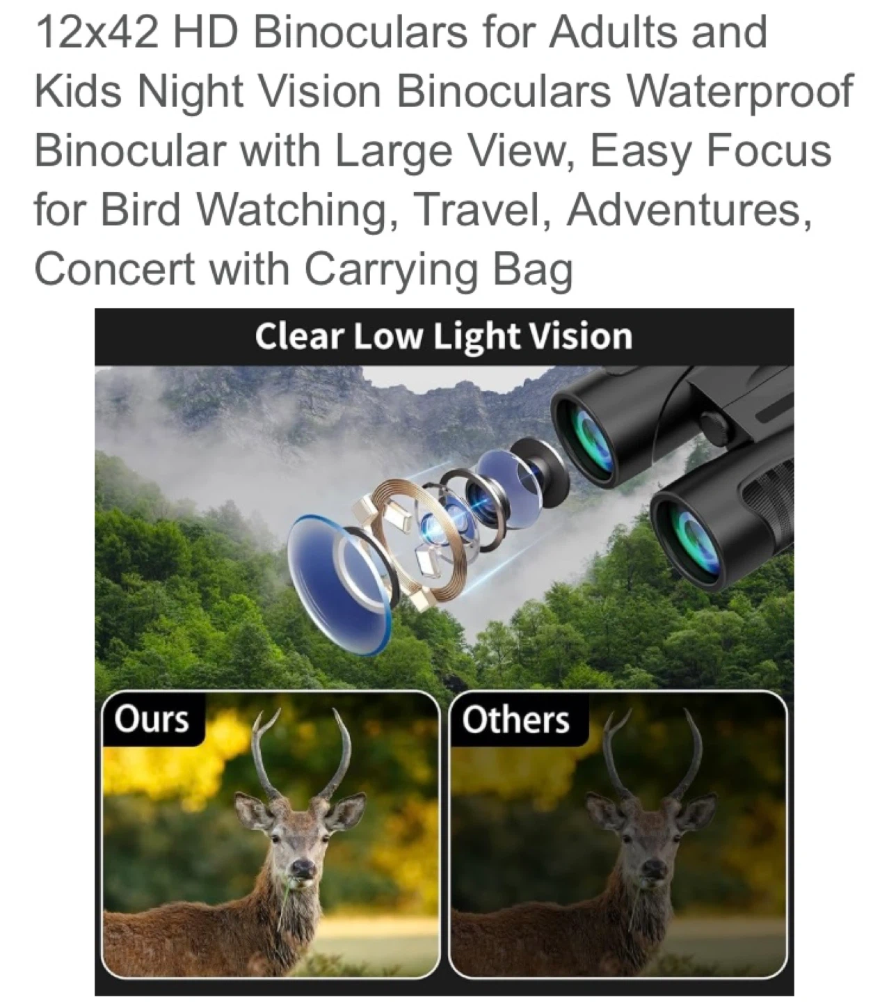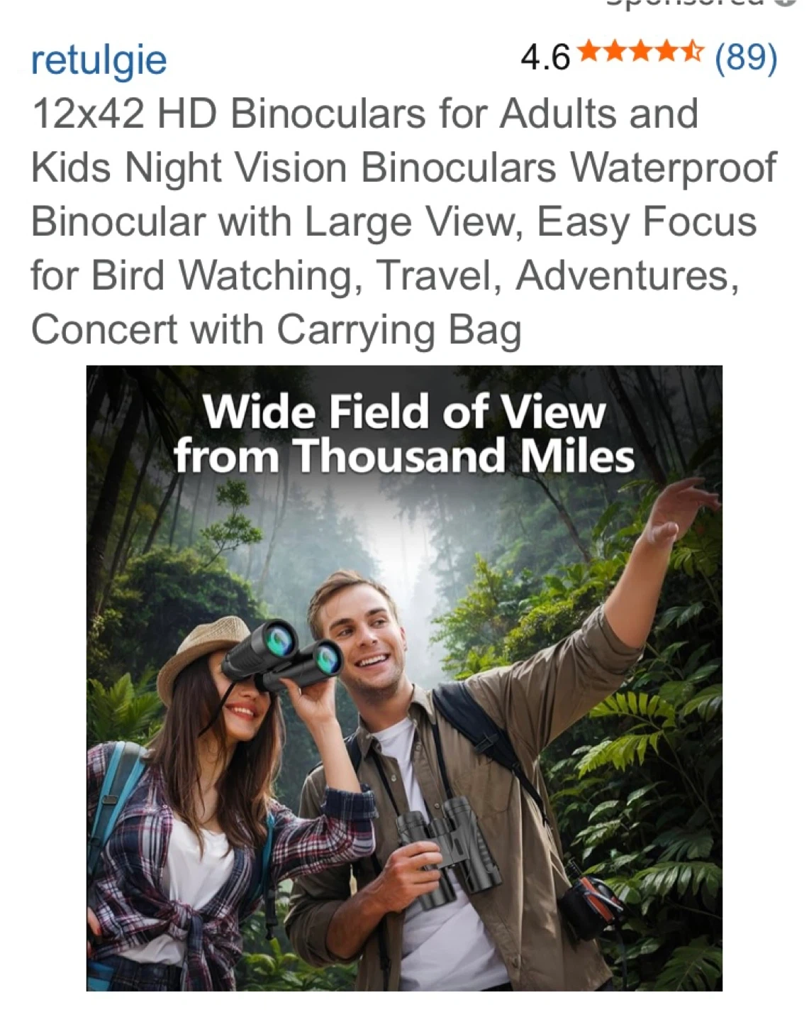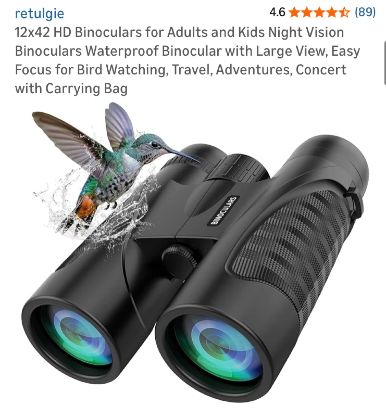 Retulgie 12x42 HD binoculars for adults and kids. Features night vision, IPX7 waterproof rating, and FMC multilayer coating. Includes a carrying bag. Great for bird watching and travel!