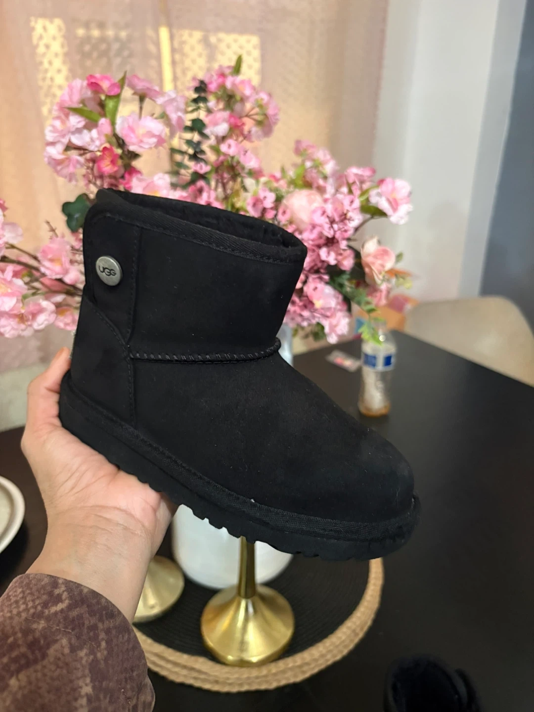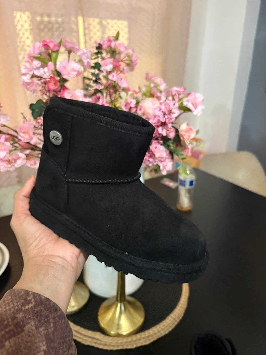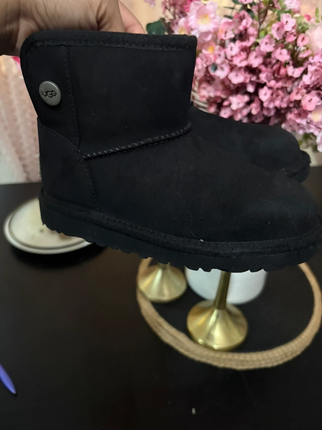 These UGG boots are black and made of suede material. They feature a cozy fleece lining for warmth. The low ankle height makes them easy to slip on and off!
