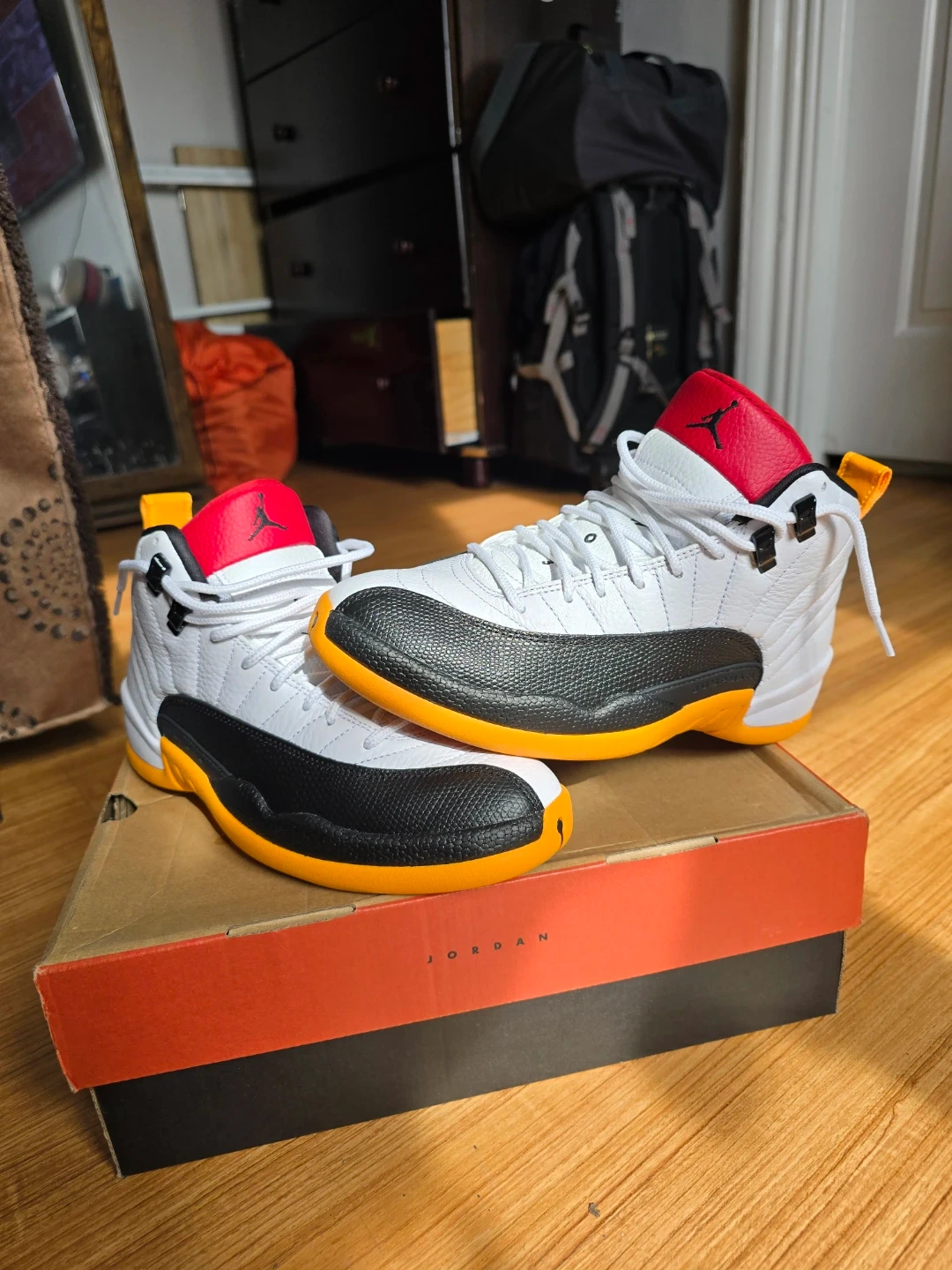 These Air Jordan 12 "Taxi" sneakers come in a white, black, and taxi yellow colorway. They feature a leather and textured synthetic upper with signature Jordan branding. Includes the original box and is size 7 Youth.
