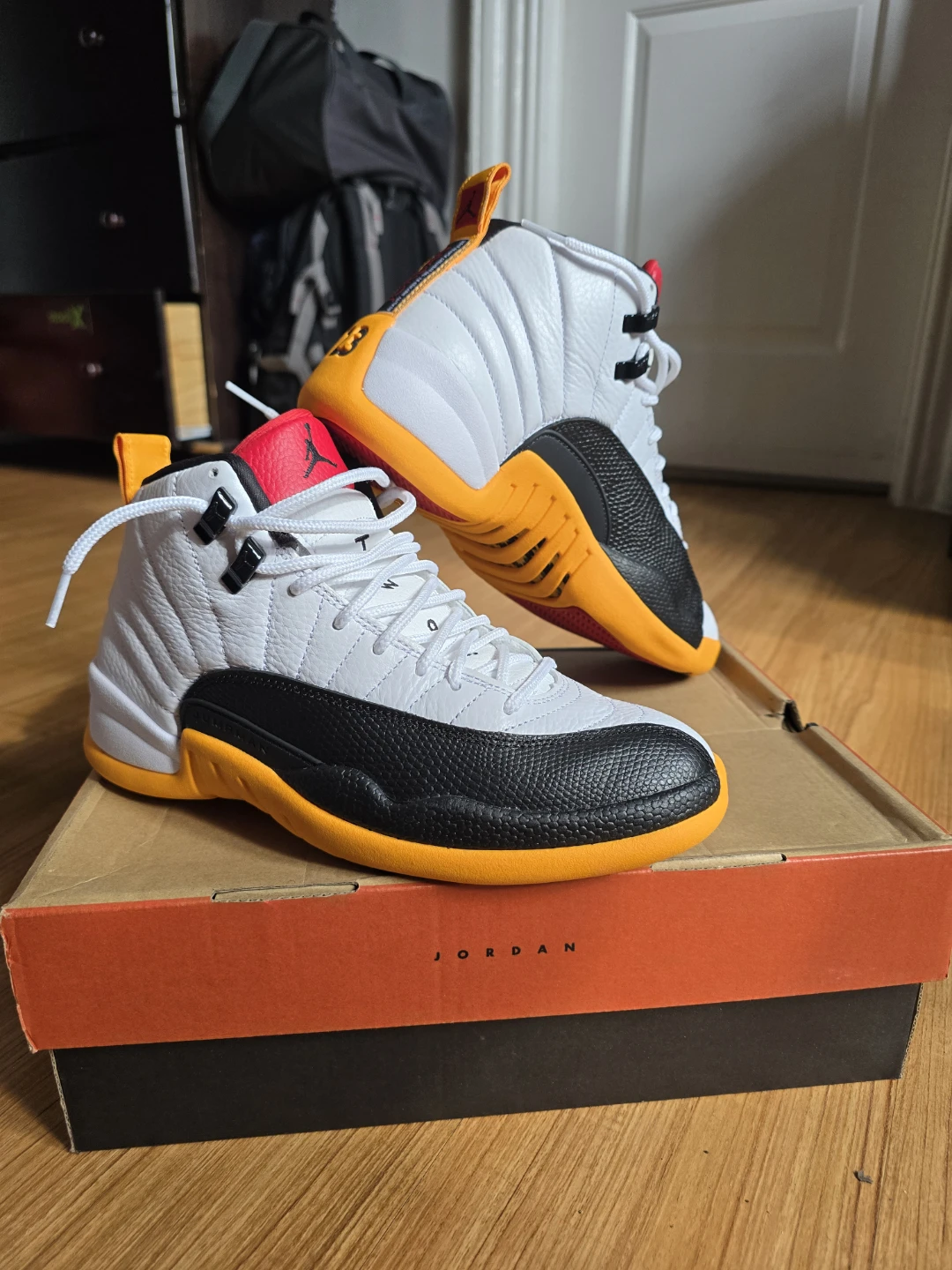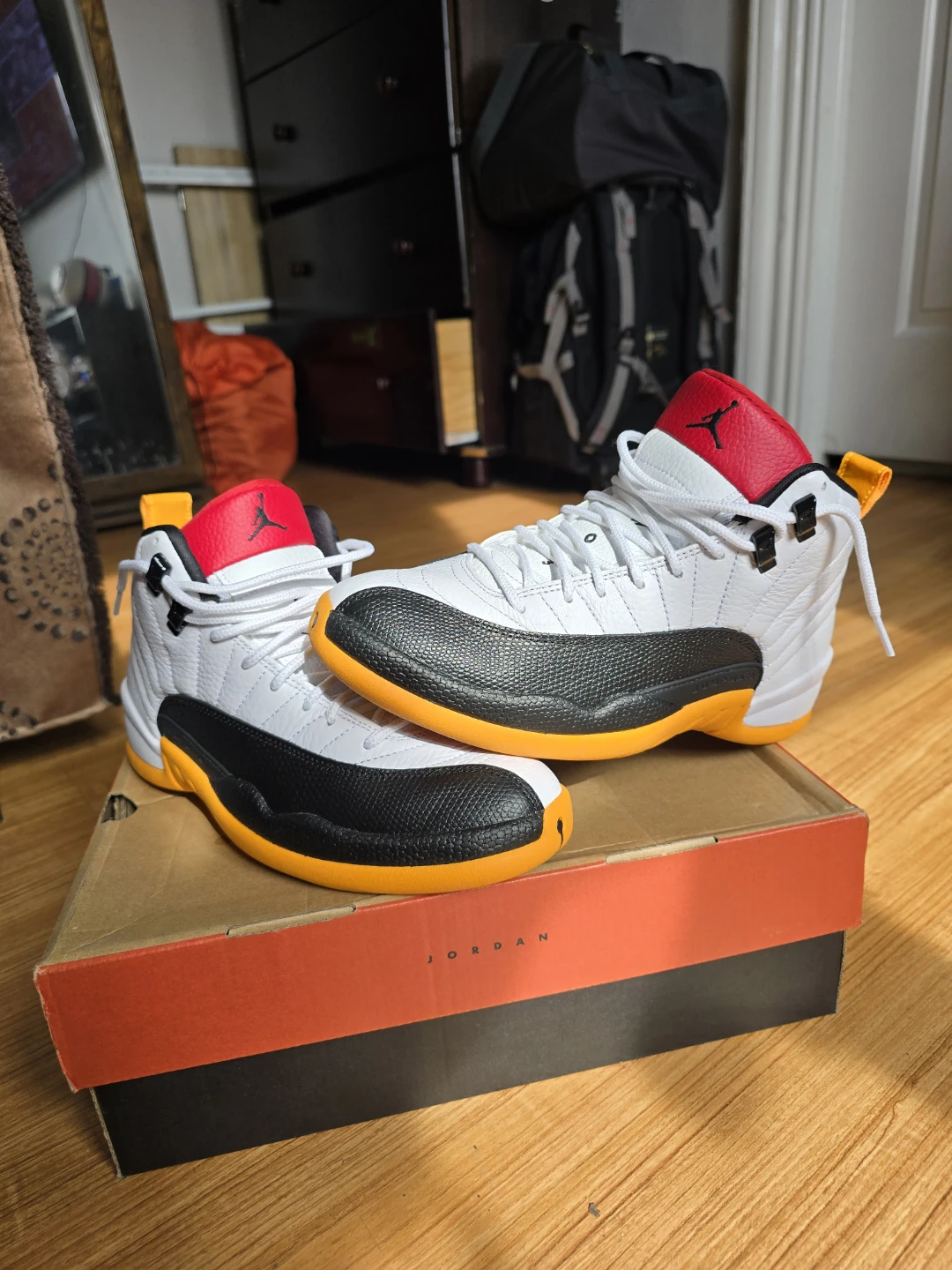 These Air Jordan 12 "Taxi" sneakers come in a white, black, and taxi yellow colorway. They feature a leather and textured synthetic upper with signature Jordan branding. Includes the original box and is size 7 Youth.