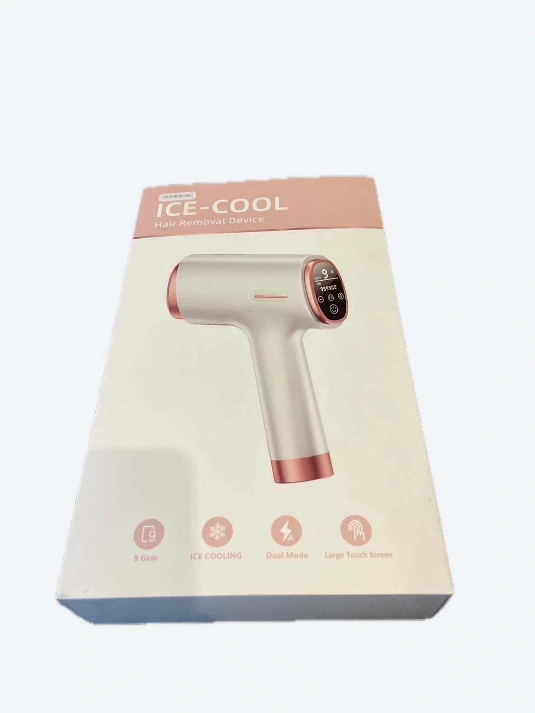 ICE-COOL hair removal device with 9 gears and ice cooling functionality. It features dual mode operation and a large touch screen for easy use. This device is designed for effective hair removal.