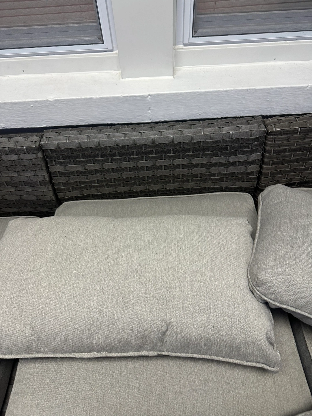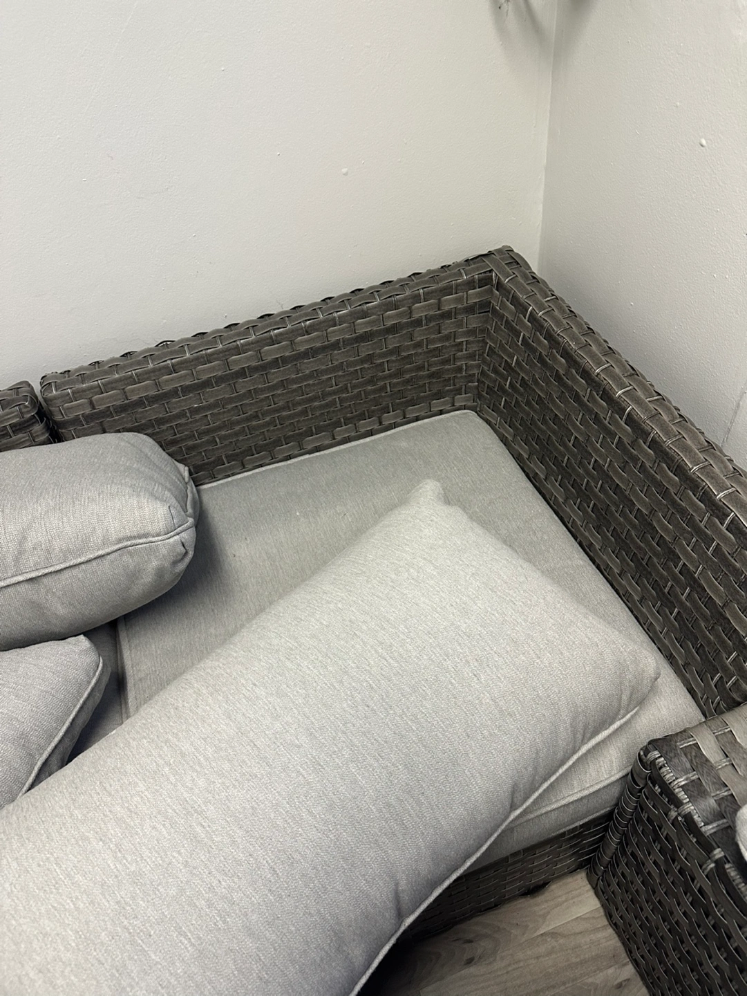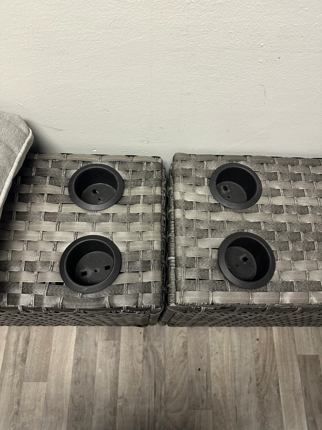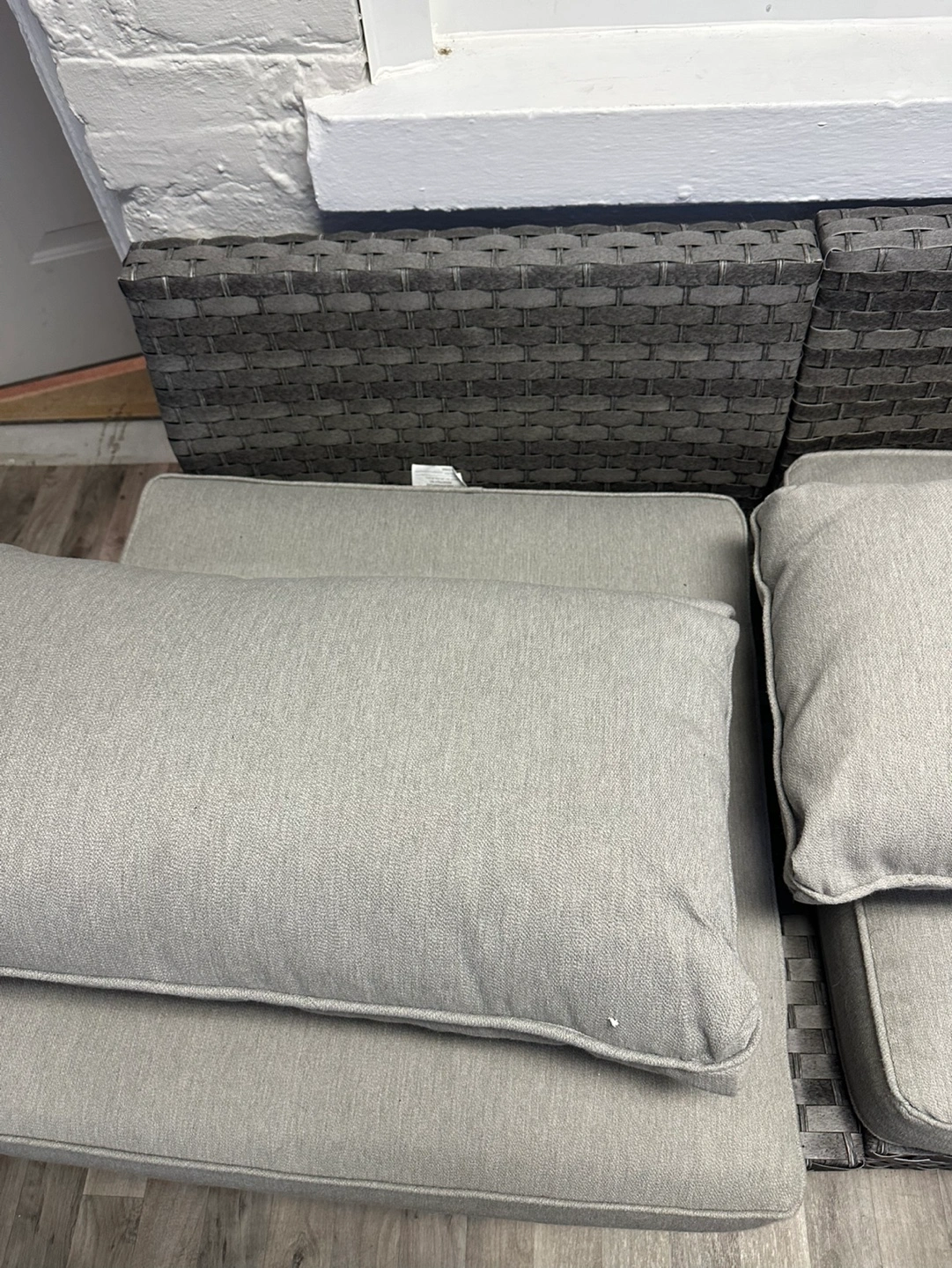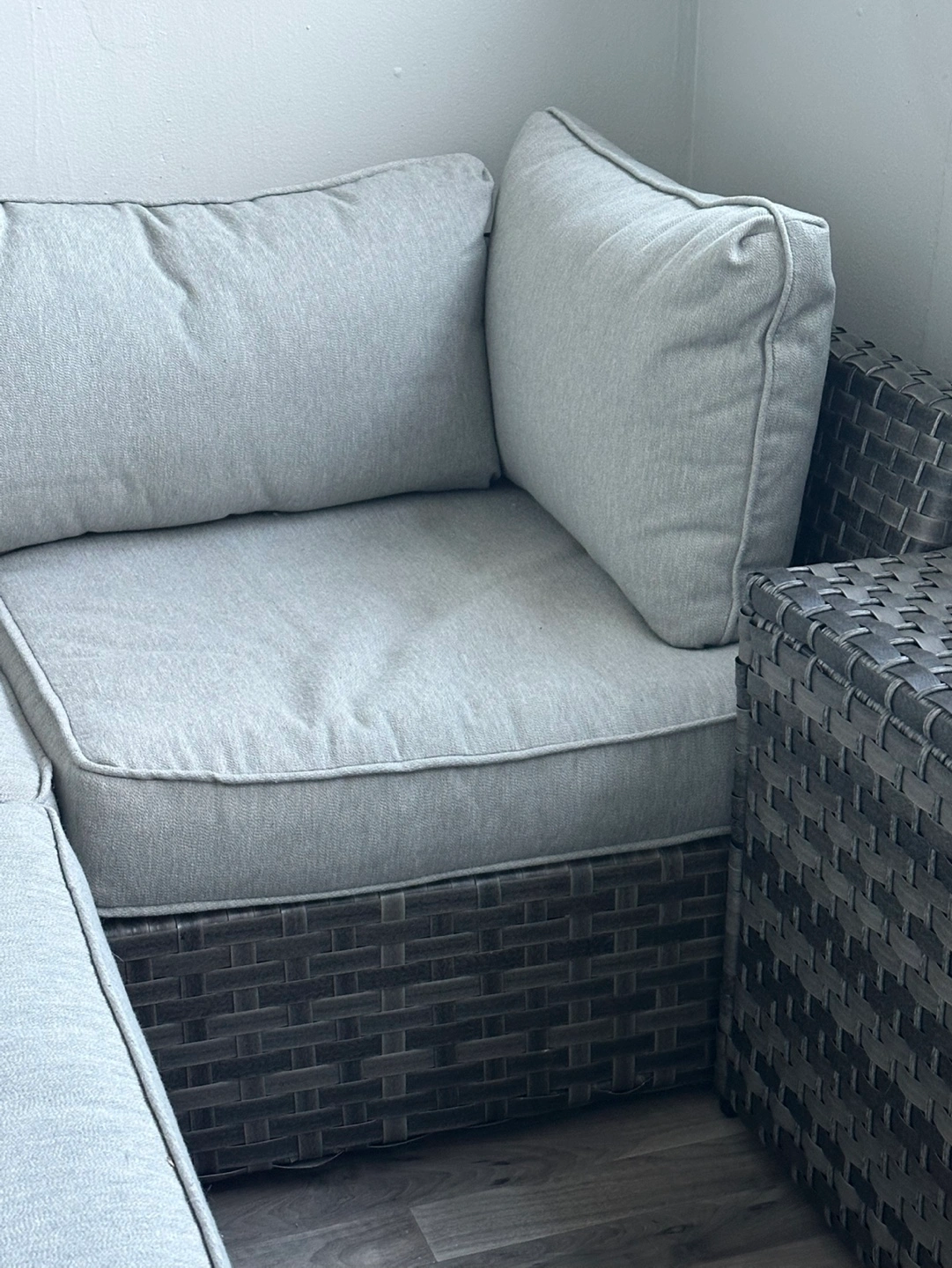 Grey plastic wicker sectional sofa. Includes light grey cushions. Three end tables with cup holders. Perfect for patio or balcony.