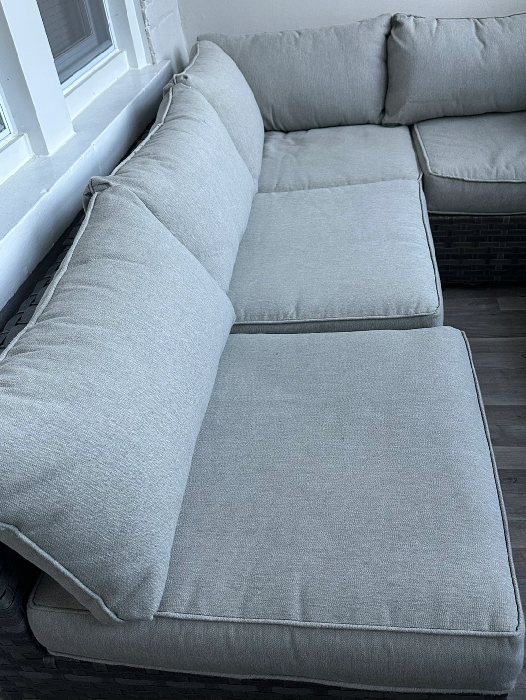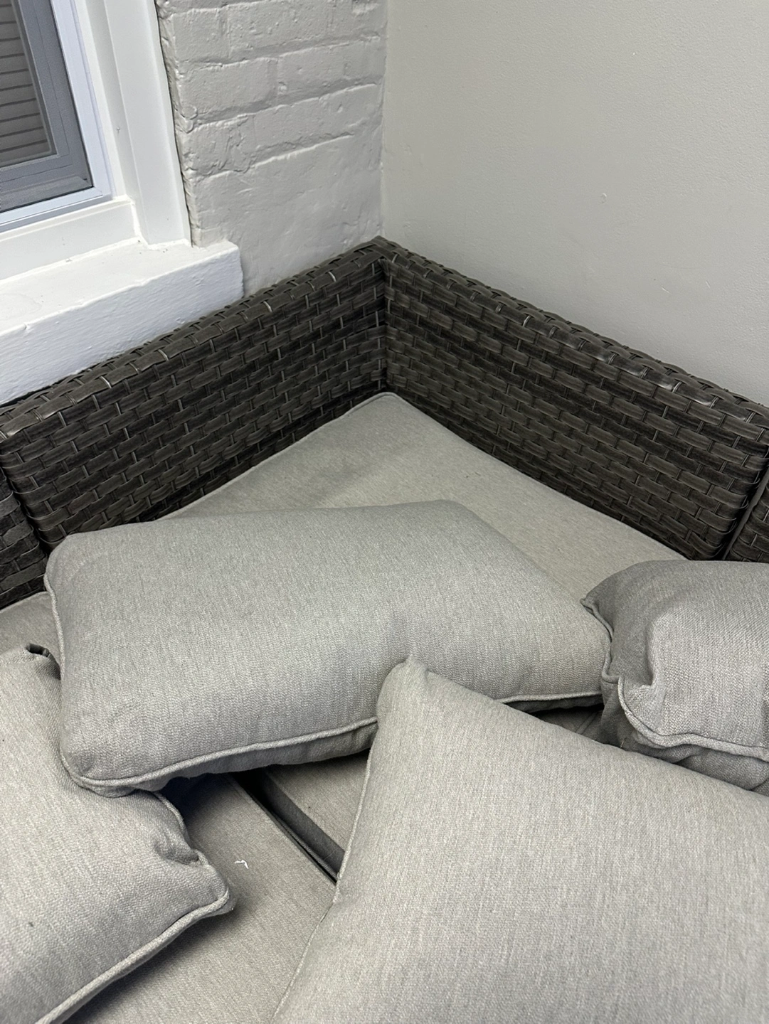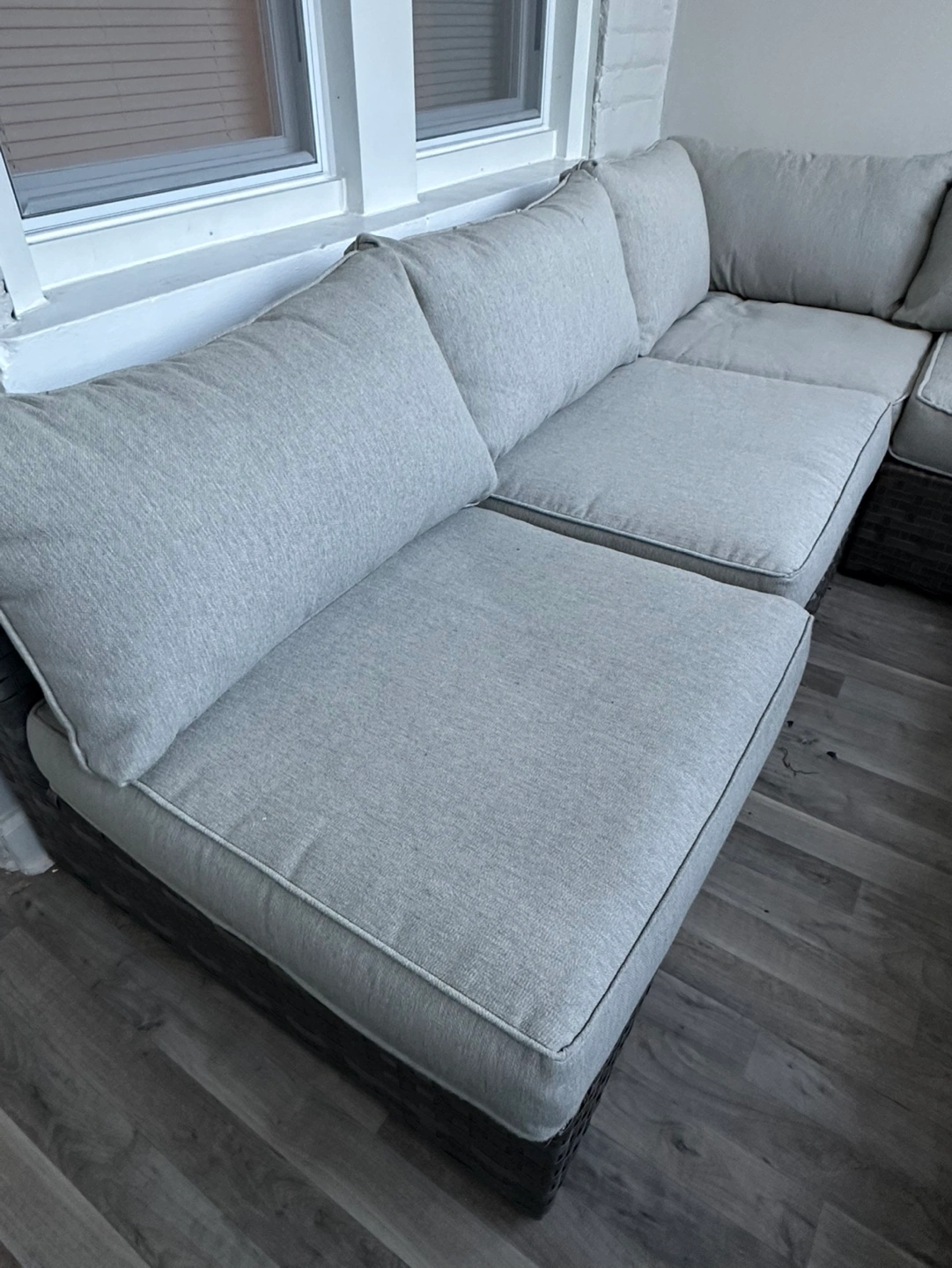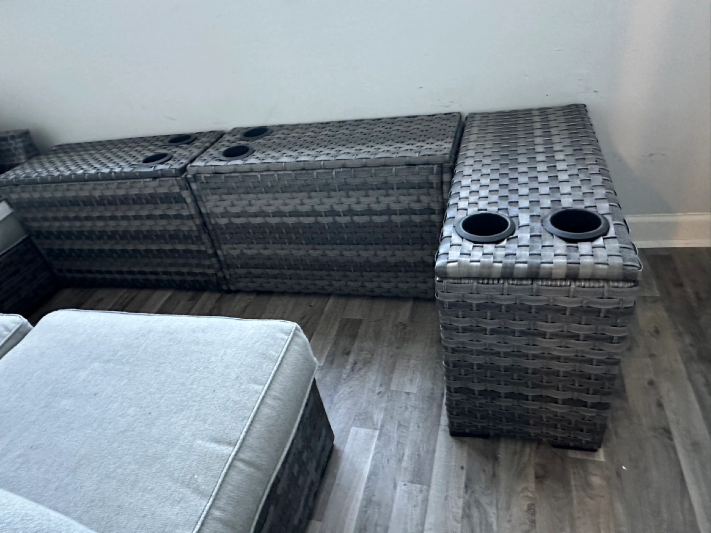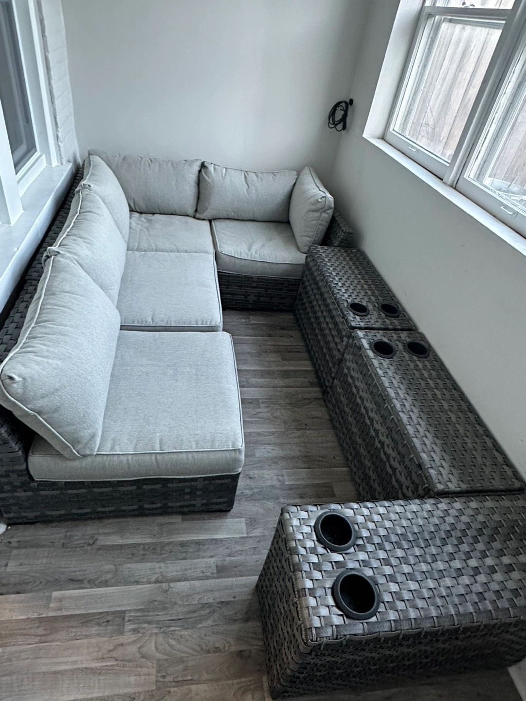 Grey plastic wicker sectional sofa. Includes light grey cushions. Three end tables with cup holders. Perfect for patio or balcony.
