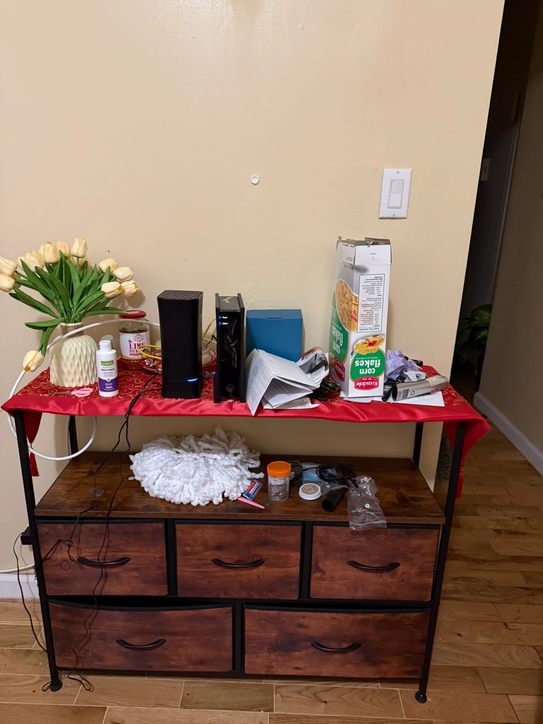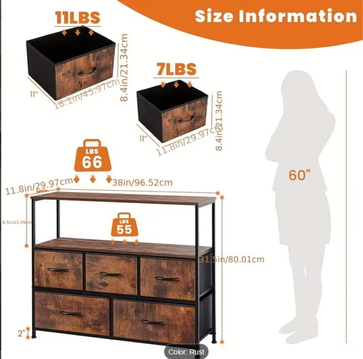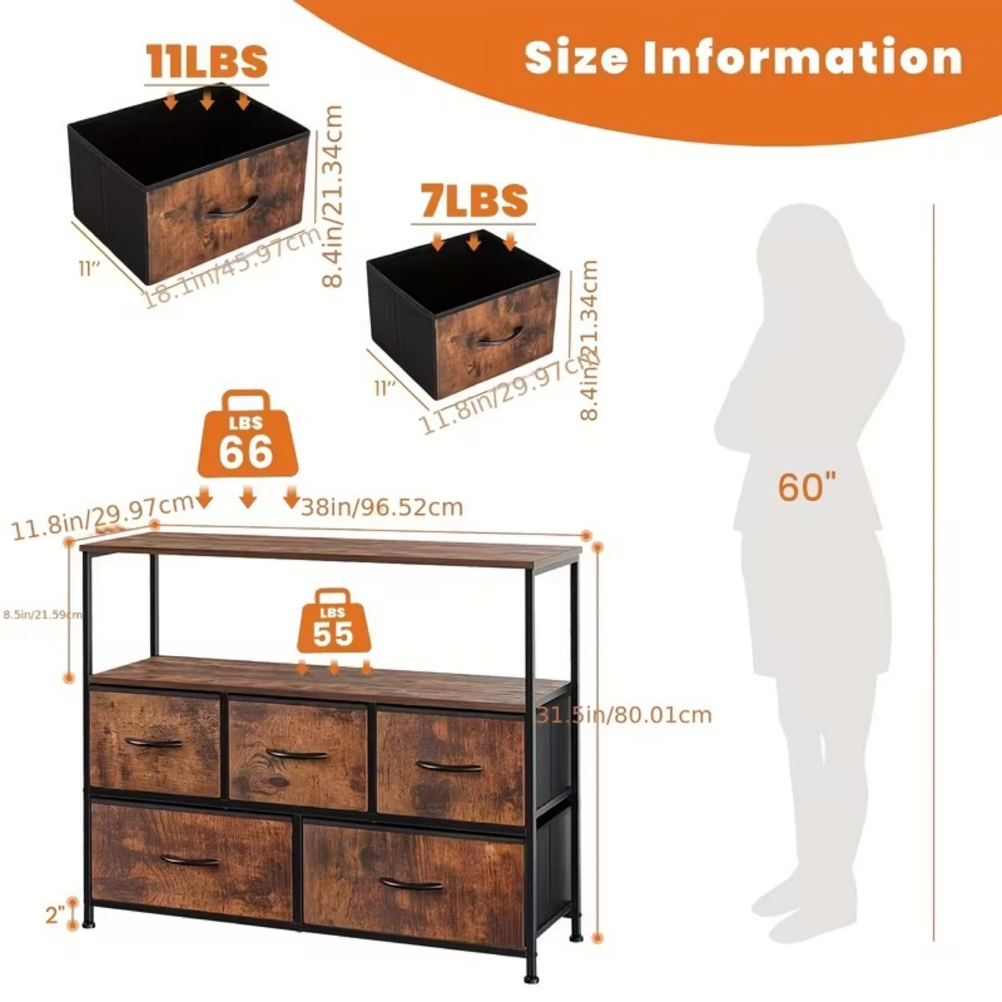 The dresser measures approximately 38 inches wide, 31.5 inches tall, and 11.8 inches deep. The drawers are about 11 inches in height and 18.1 inches in width. The top shelf can hold up to 66 lbs, while the drawers can hold up to 55 lbs