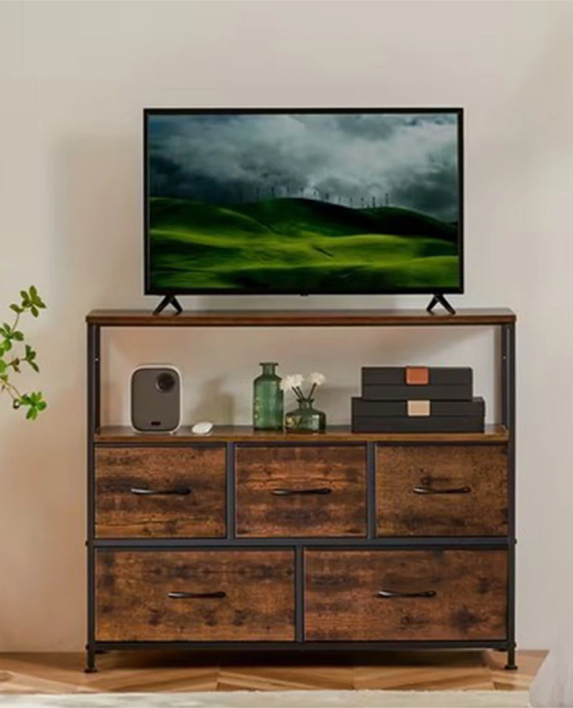 This rustic brown dresser features five spacious drawers and a sturdy metal frame! It's perfect for adding some storage and style to any room.
