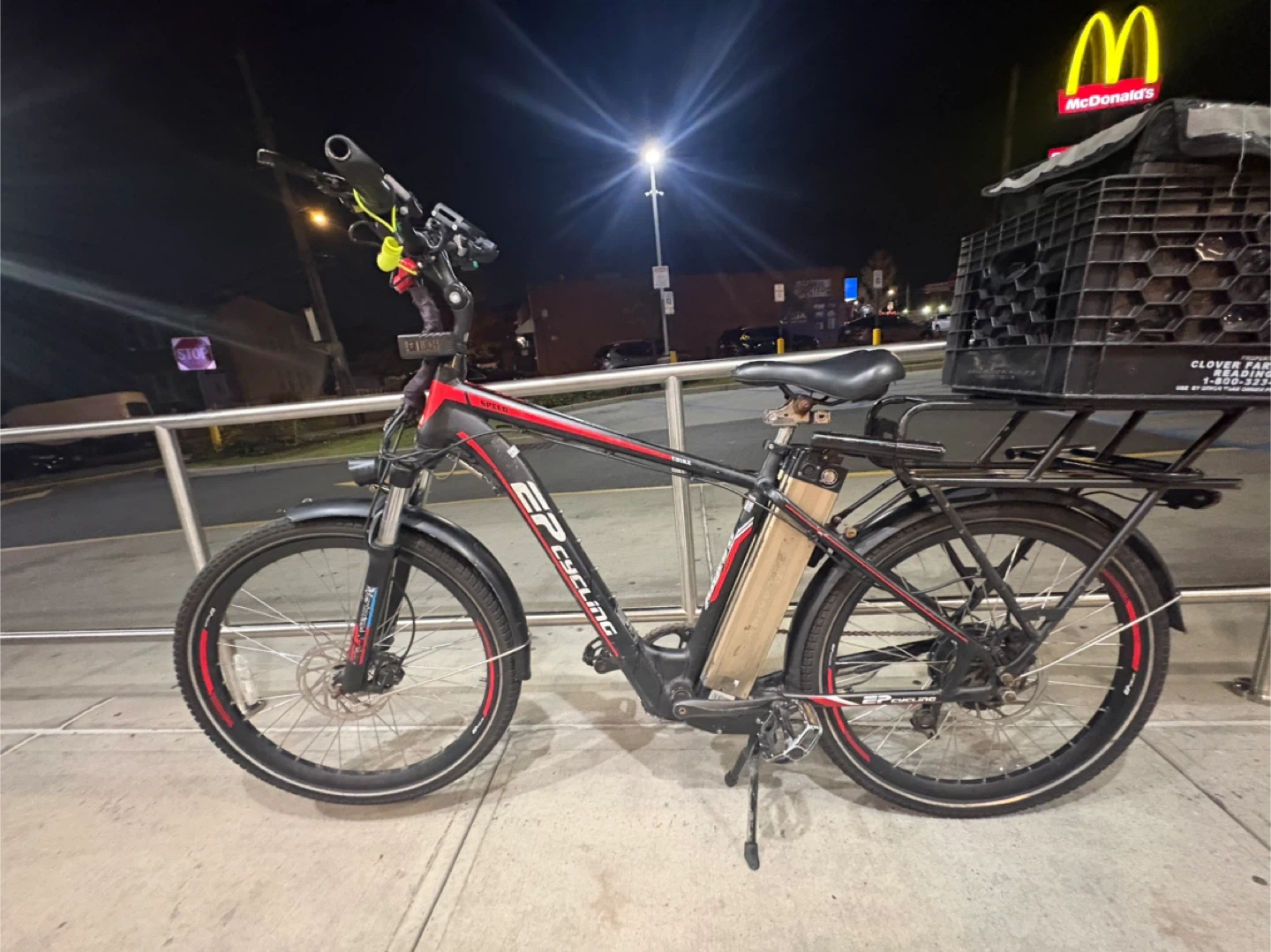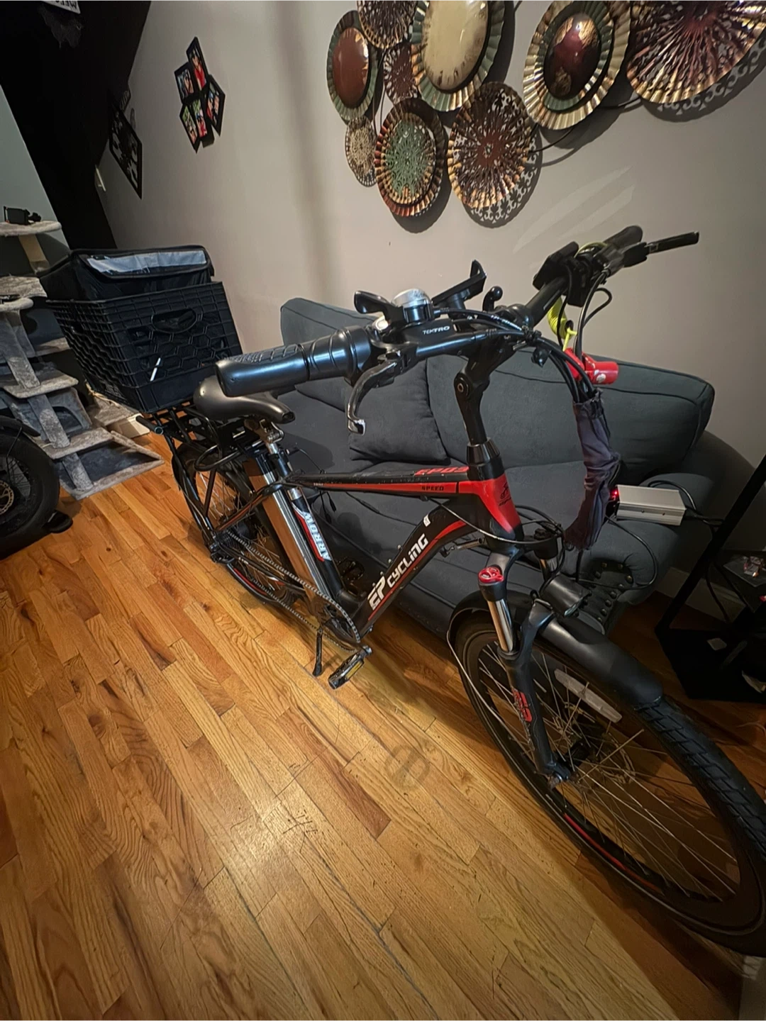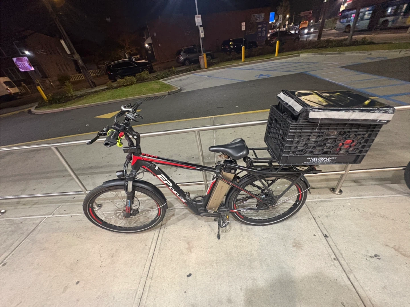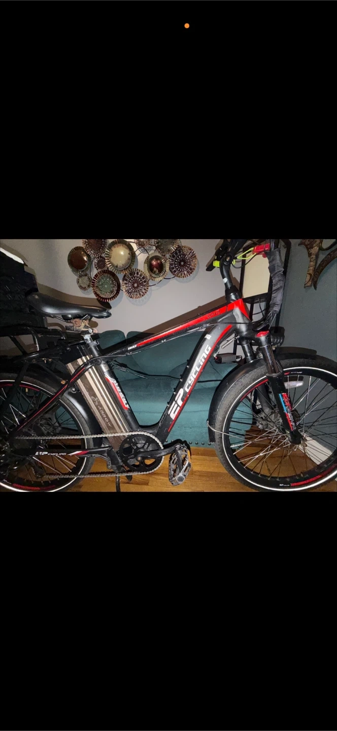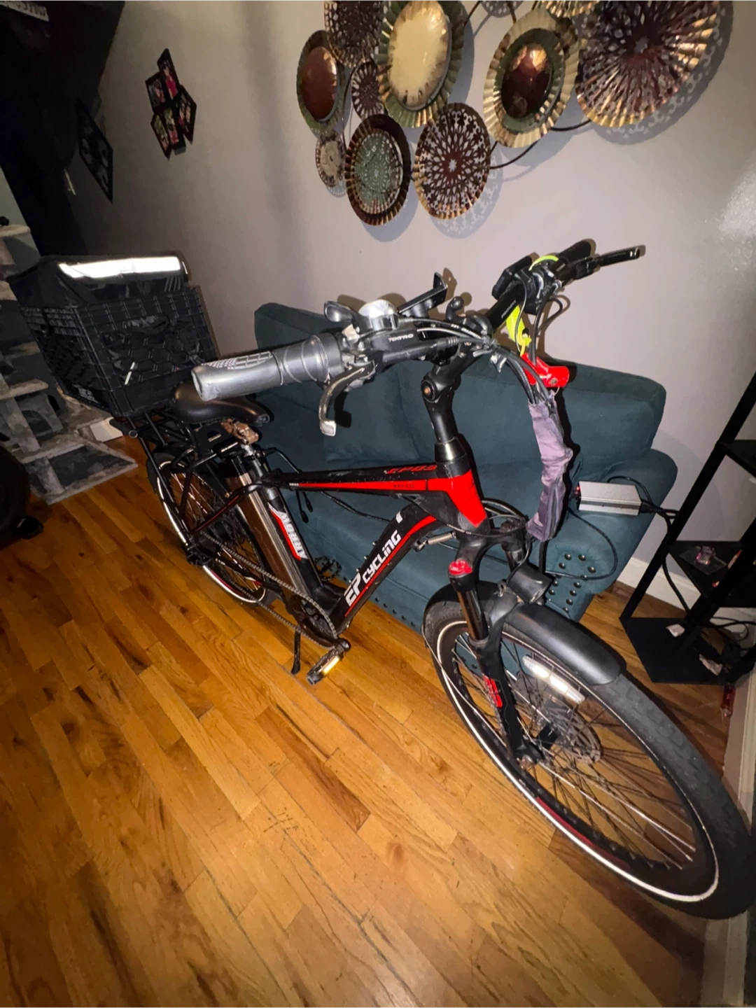 Selling an EP Cycling electric bike in black and red. It has a basket attached to the back for carrying items. Great for getting around town!