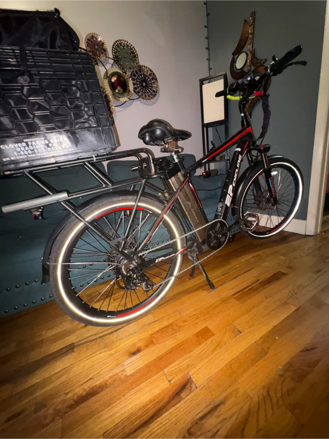 Selling an EP Cycling electric bike in black and red. It has a basket attached to the back for carrying items. Great for getting around town!