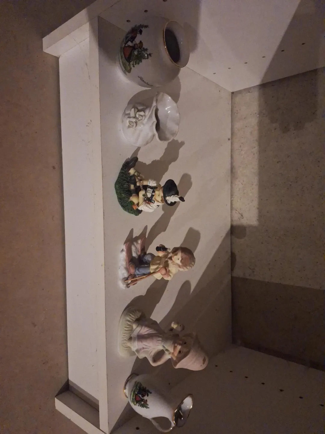 This collection includes several ceramic decorative items. There's a round vase with a pastoral scene, a shell-shaped dish with roses, and various figurines of children and people in traditional attire. Also included is a small pitcher with a decorative image. These pieces add a charming touch to any shelf or display cabinet. If you are interested in 1 or a couple let me know