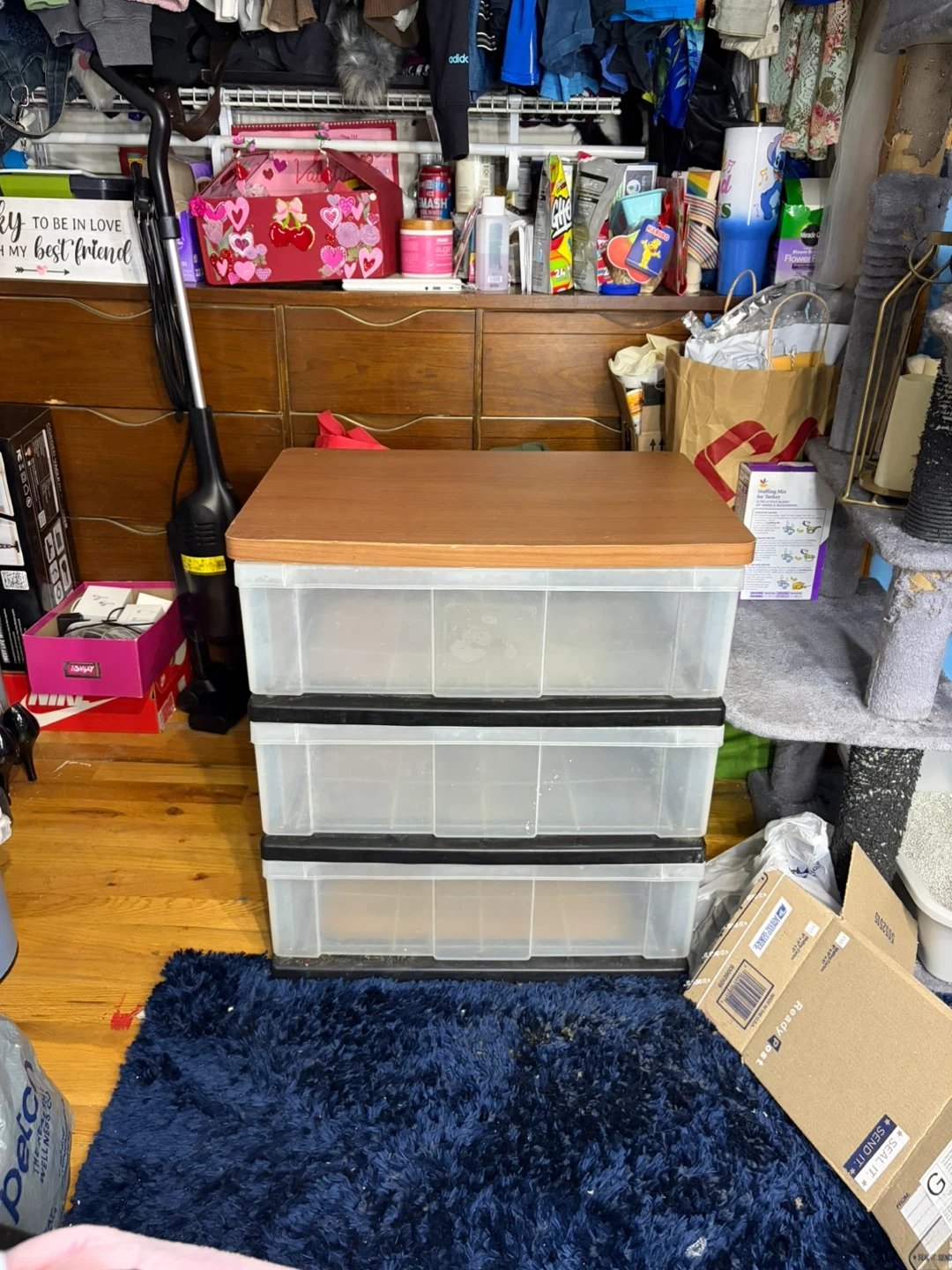 3-tier clear storage bin with wooden top
