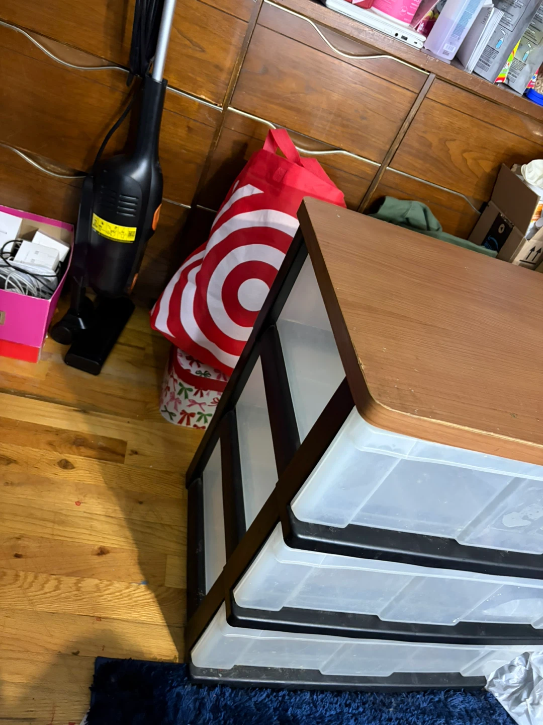 3-tier clear storage bin with wooden top
