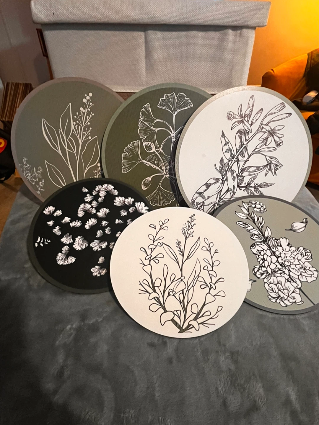 Selling a set of six decorative wood wall plaques. Each plaque features a different botanical design in black and white on a neutral background. 3 - large (10”); 3 - medium (8”). Metal hooks included. These are perfect for adding a touch of nature to your home decor!