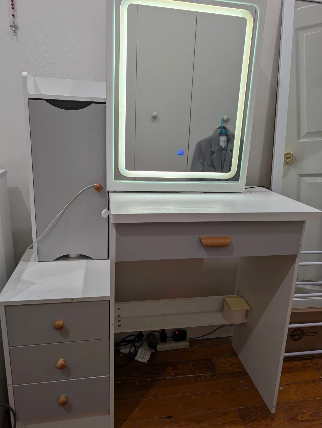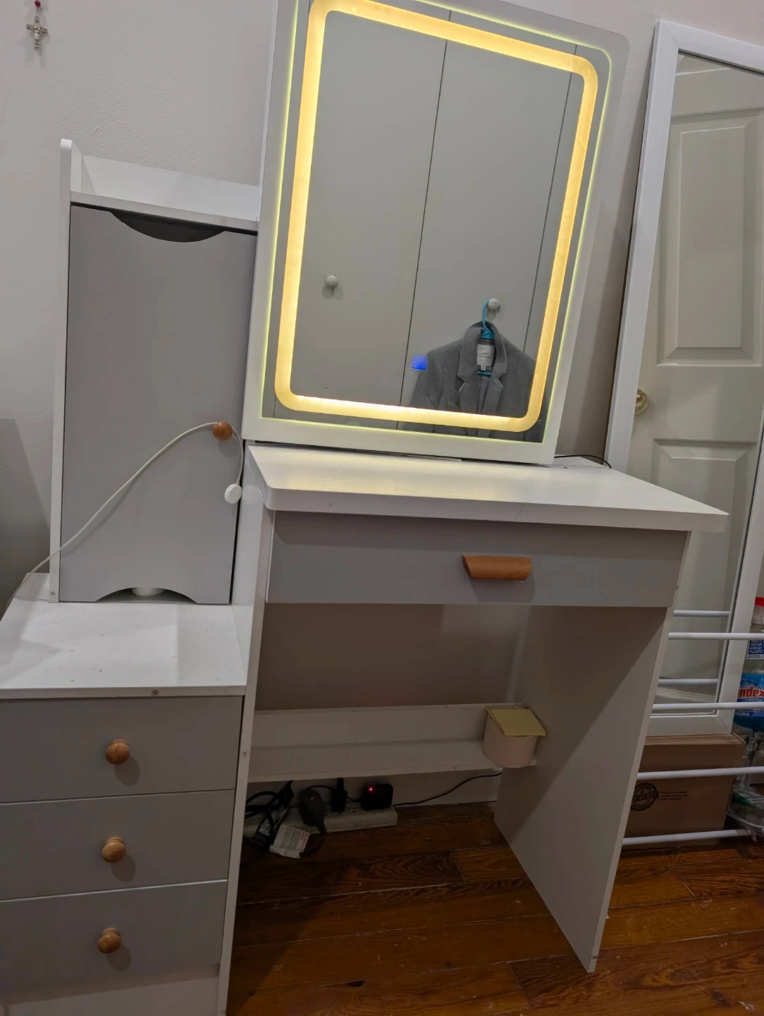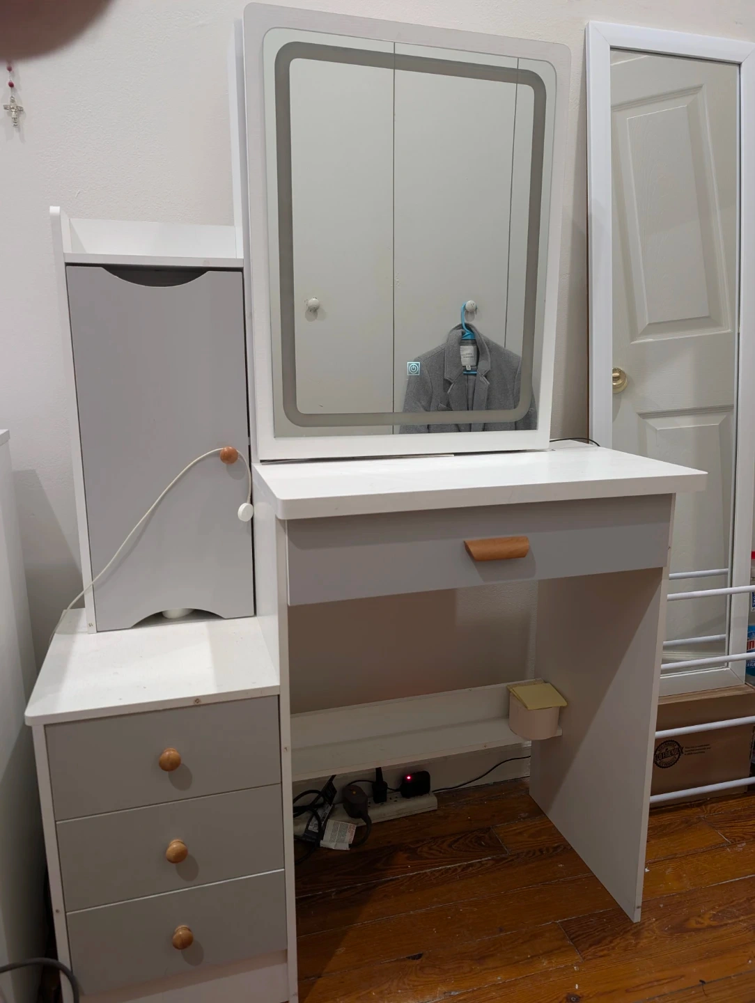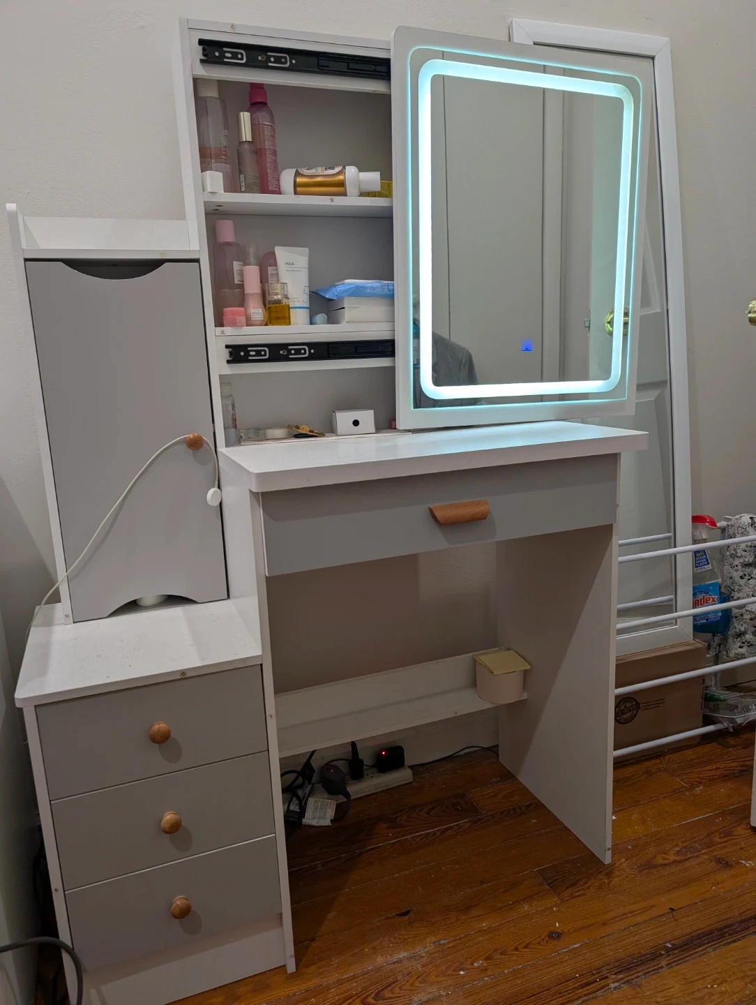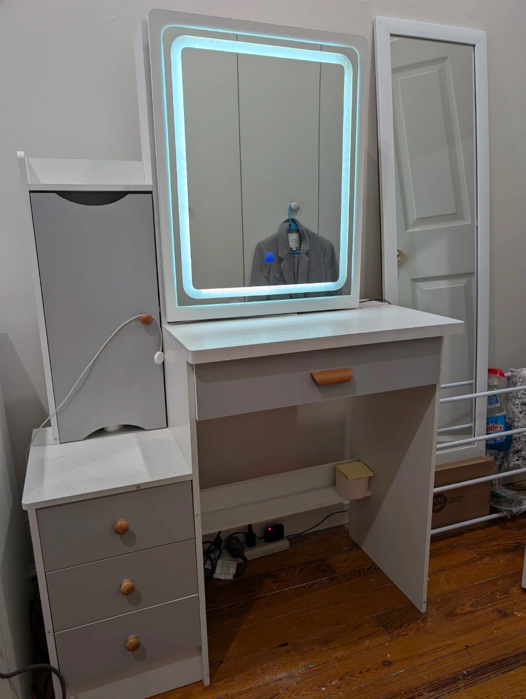 White and gray vanity desk featuring a built-in LED mirror. It includes multiple storage drawers and shelves to organize your makeup and accessories. This is a great piece for any bedroom or dressing area!