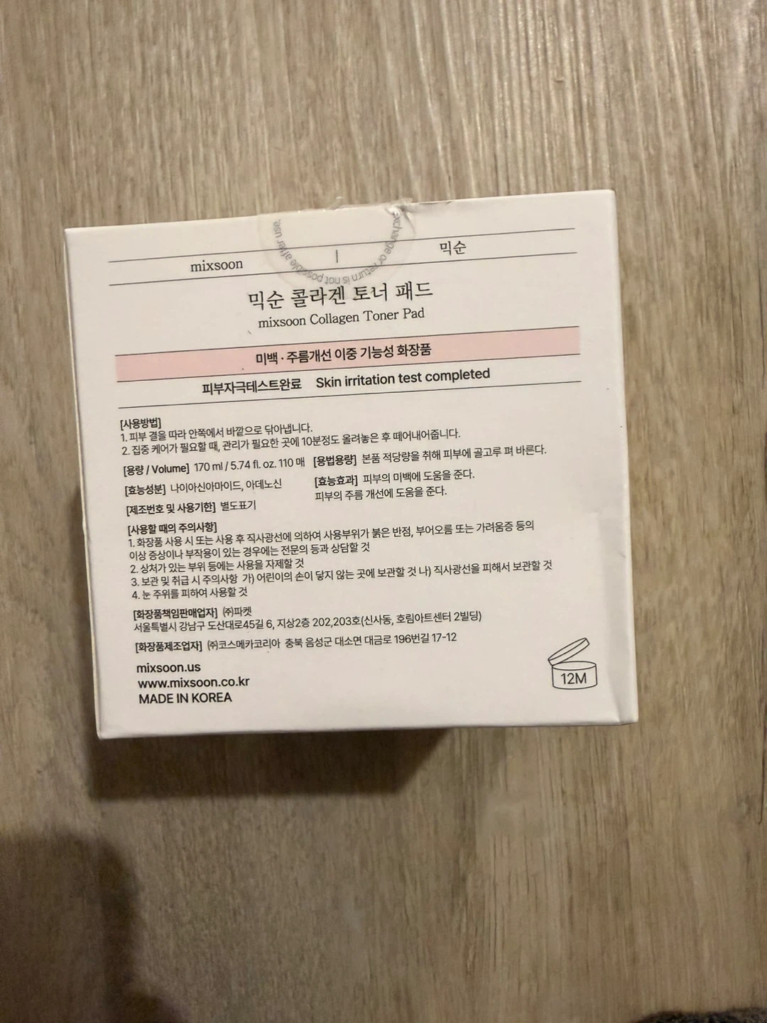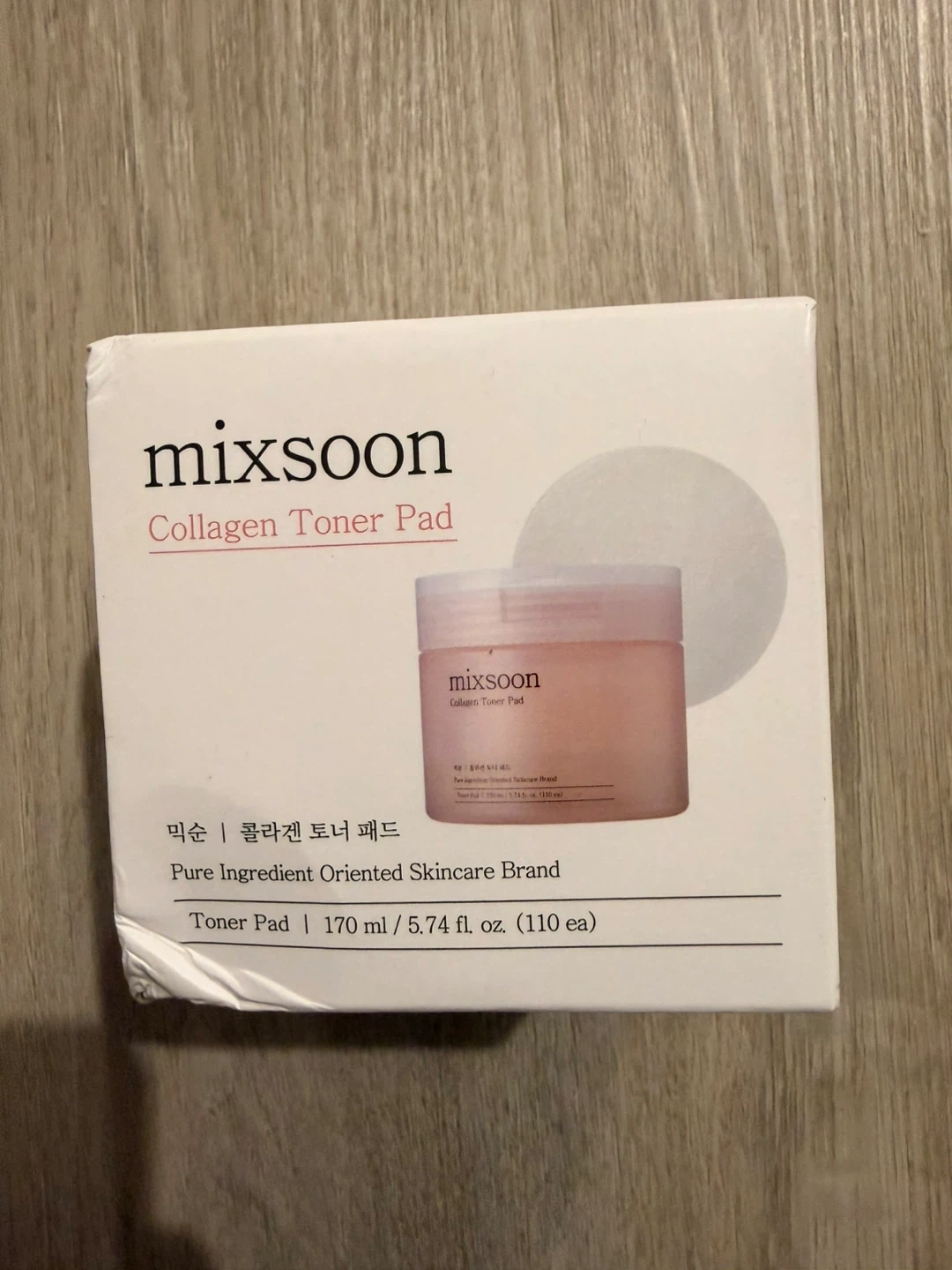 This is the Mixsoon Collagen Toner Pad. It's a pure ingredient-oriented skincare brand product. The toner pad is 170 ml / 5.74 fl. oz. and contains 110 pads. The price is $20