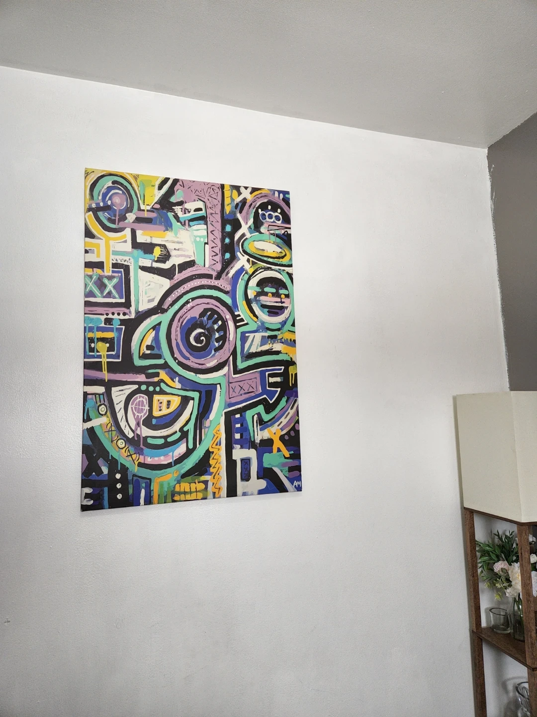 This is an abstract piece on canvas. It features a vibrant mix of colors including purple, blue, yellow, and teal. Cash only