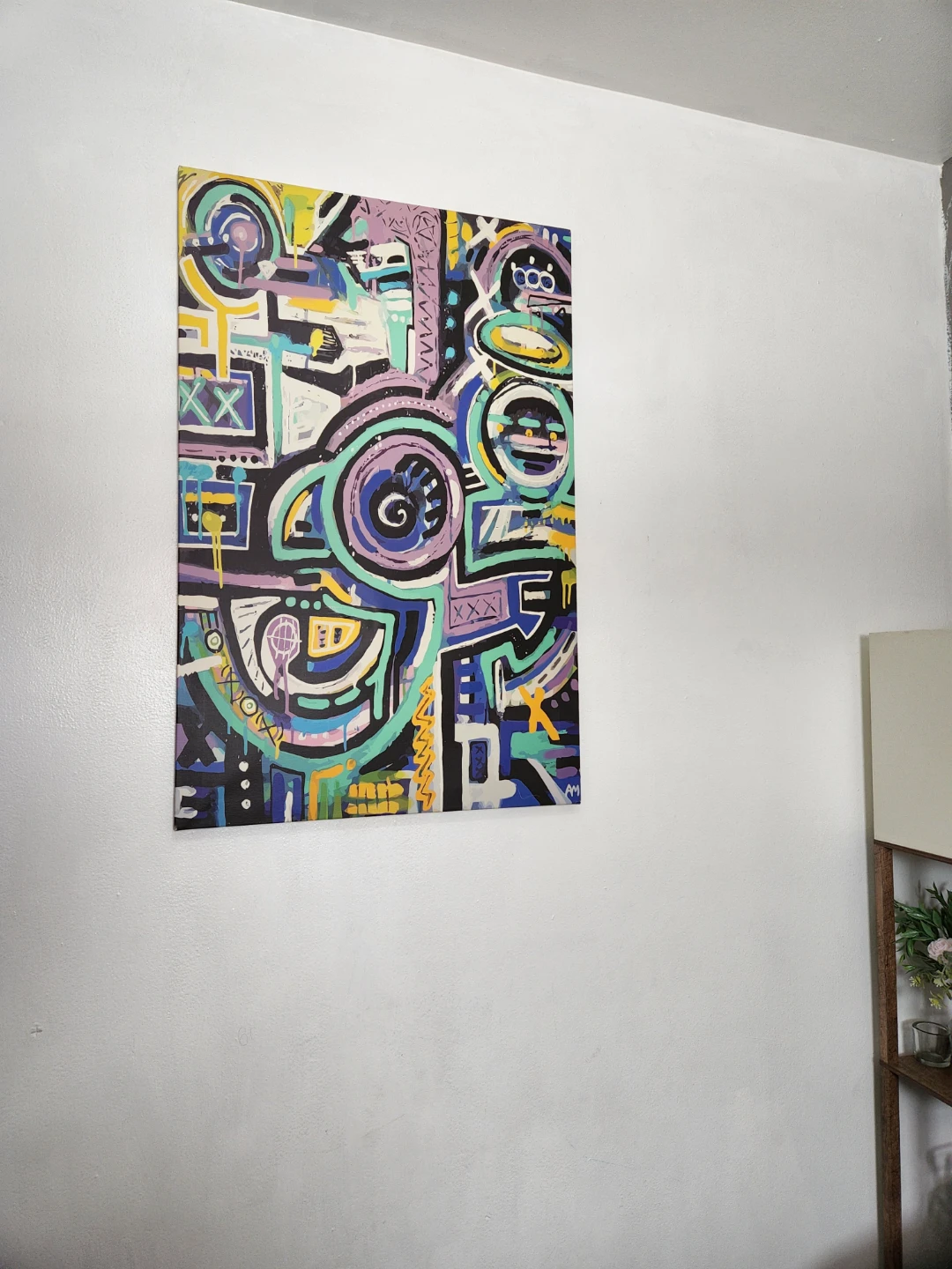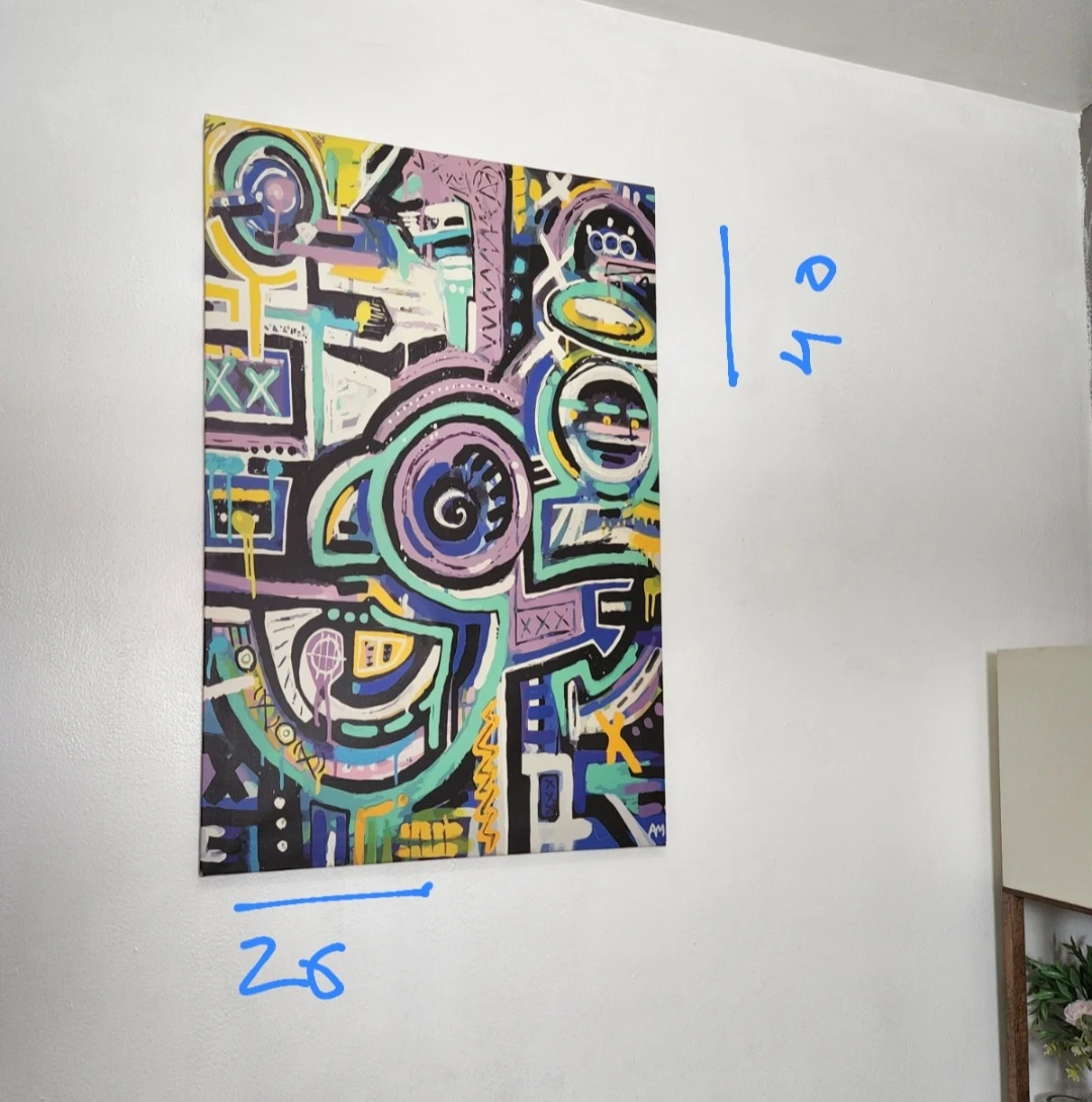 This is an abstract piece on canvas. It features a vibrant mix of colors including purple, blue, yellow, and teal. Cash only