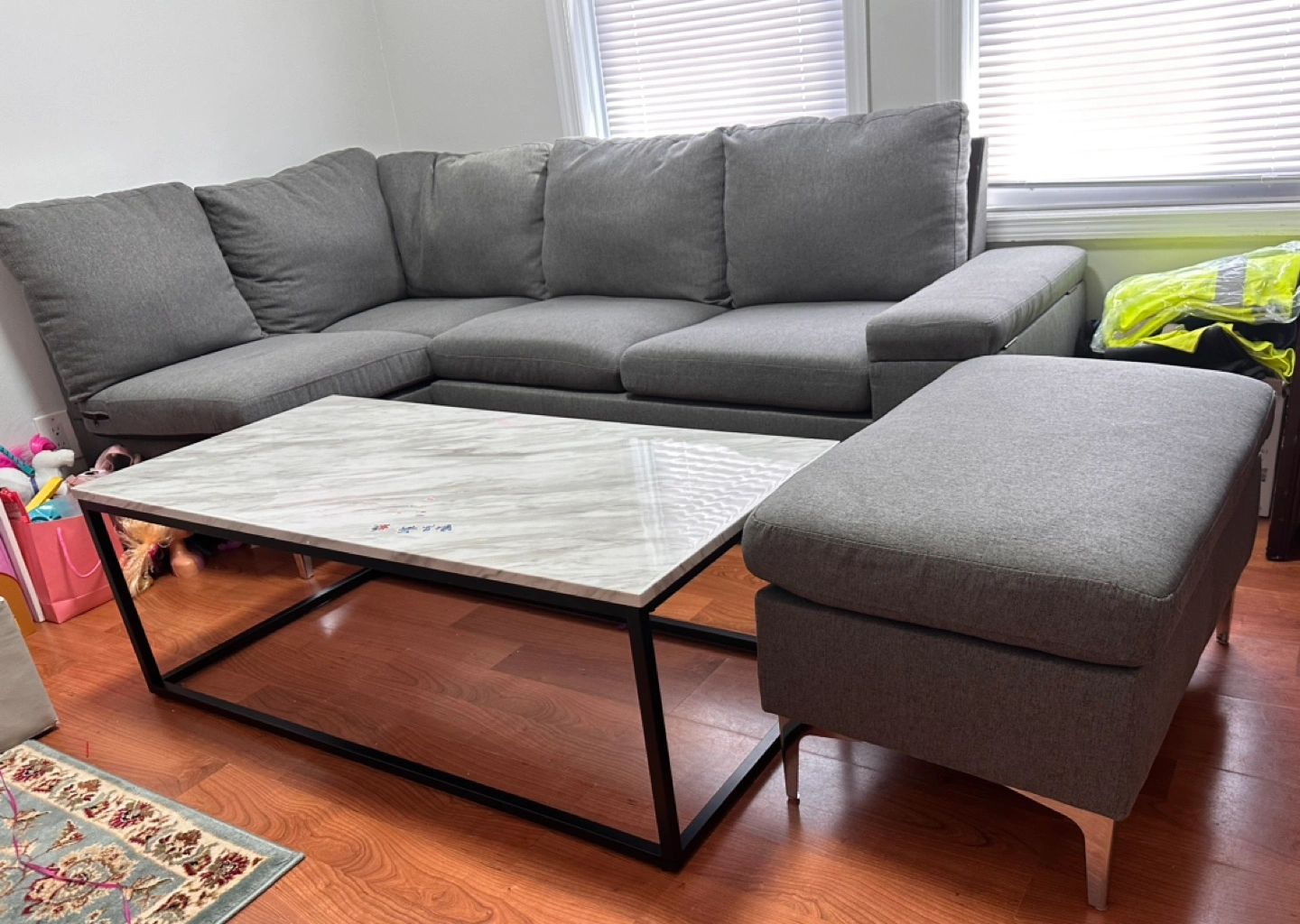 Corner sofa + coffee table + part seat, in a very good condition , which could be used separately and has a storage space inside. bought but never used , we sell it because we remodeling our kid’s room