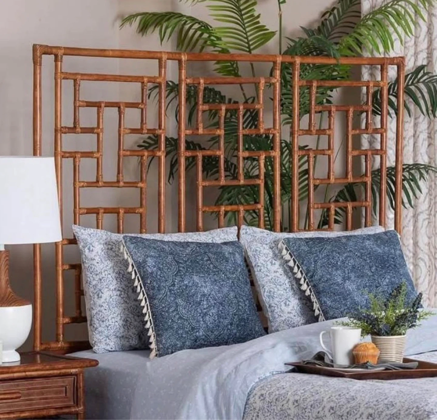New Queen Size Chinoiserie Pagodas Boho Bohemian Solid Wood Headboard
