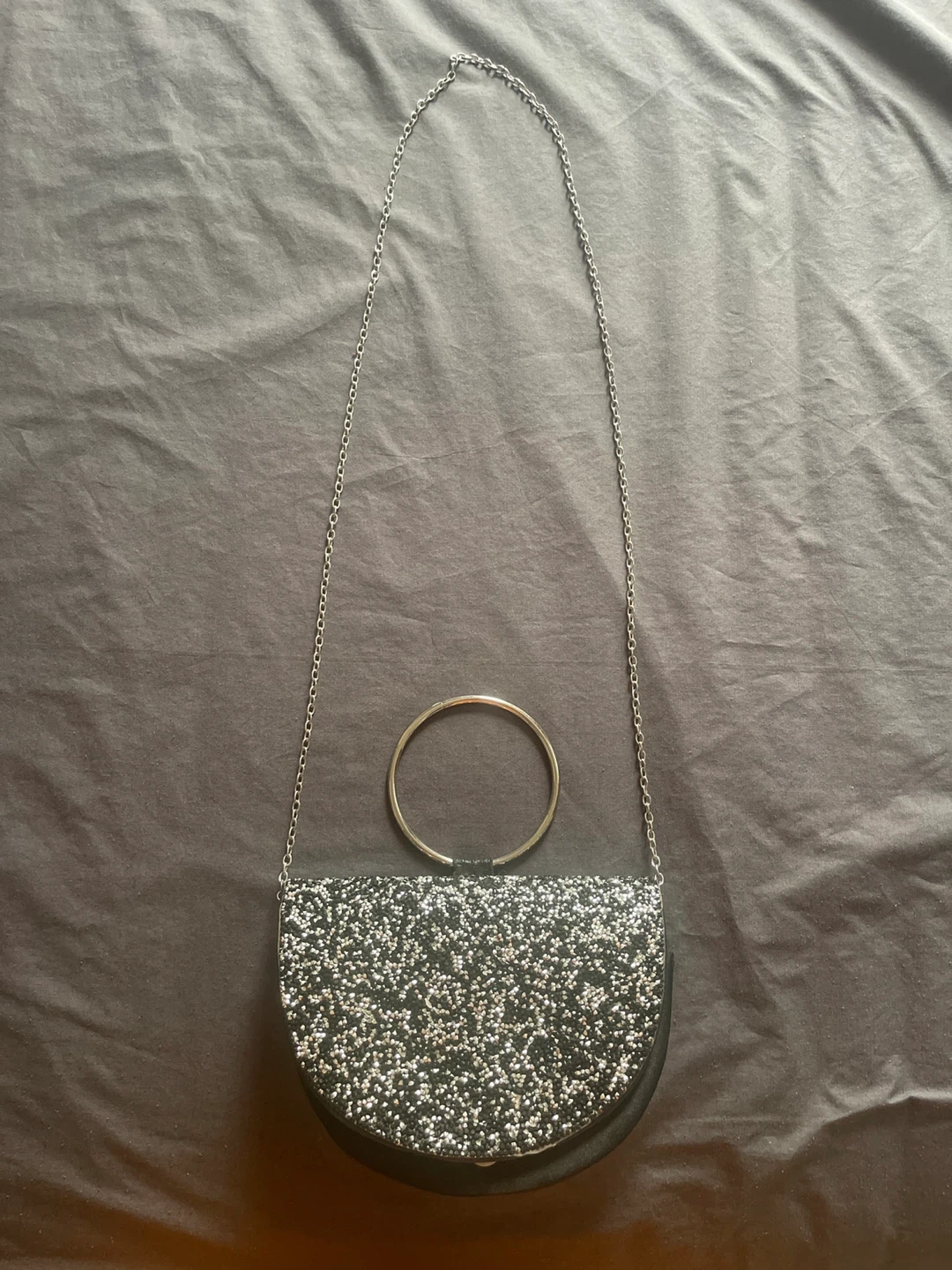 This sparkly clutch handbag is embellished with silver and black beads. It features a metal ring handle and a detachable silver chain strap. Perfect for a night out!
