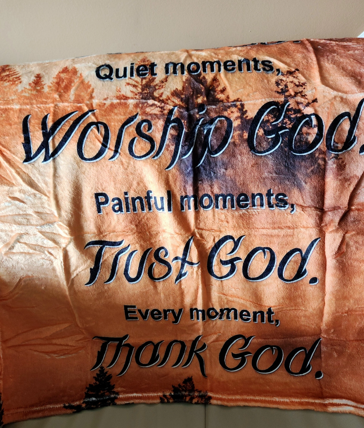 Soft fleece blanket. Features inspirational quotes and a nature scene. Perfect for snuggling up on the couch.