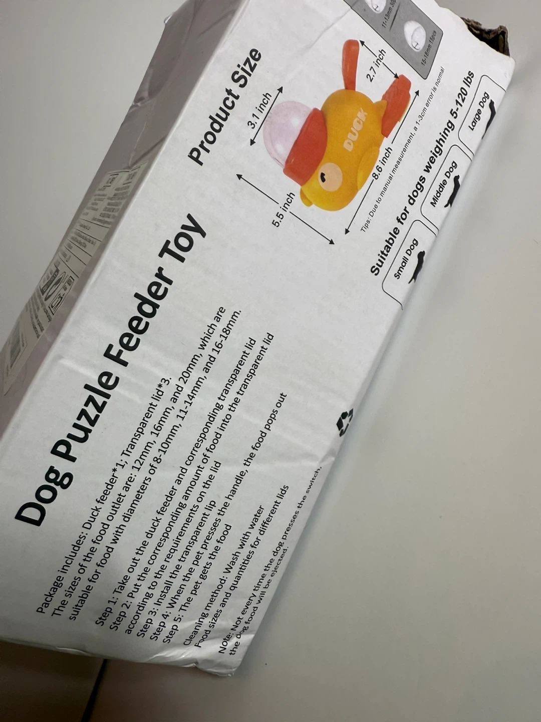 Looking to keep your furry friend entertained? This Duck Dog Puzzle Feeder Toy is a great way to engage your dog's mind while they eat! It's designed to be suitable for dogs weighing 5-120 lbs. The package includes a Duck feeder and replacement transparent lid. The sizes of the food outlet are 12mm, 16mm, and 20mm, which are suitable for food with diameters of 8-10mm, 11-14mm, and 16-18mm. The product size is 3.1 inch x 8.6 inch x 5.5 inch