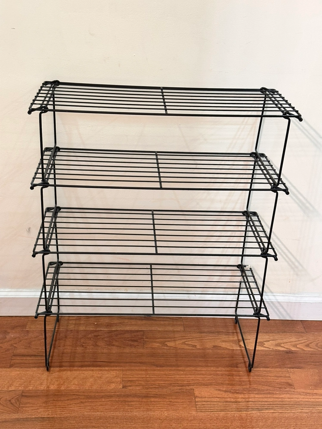 Black metal wire shelf with four tiers. Good condition. You can stack them or you can have them next to each other. They don’t all have to be on top of each each other. Great for small places.