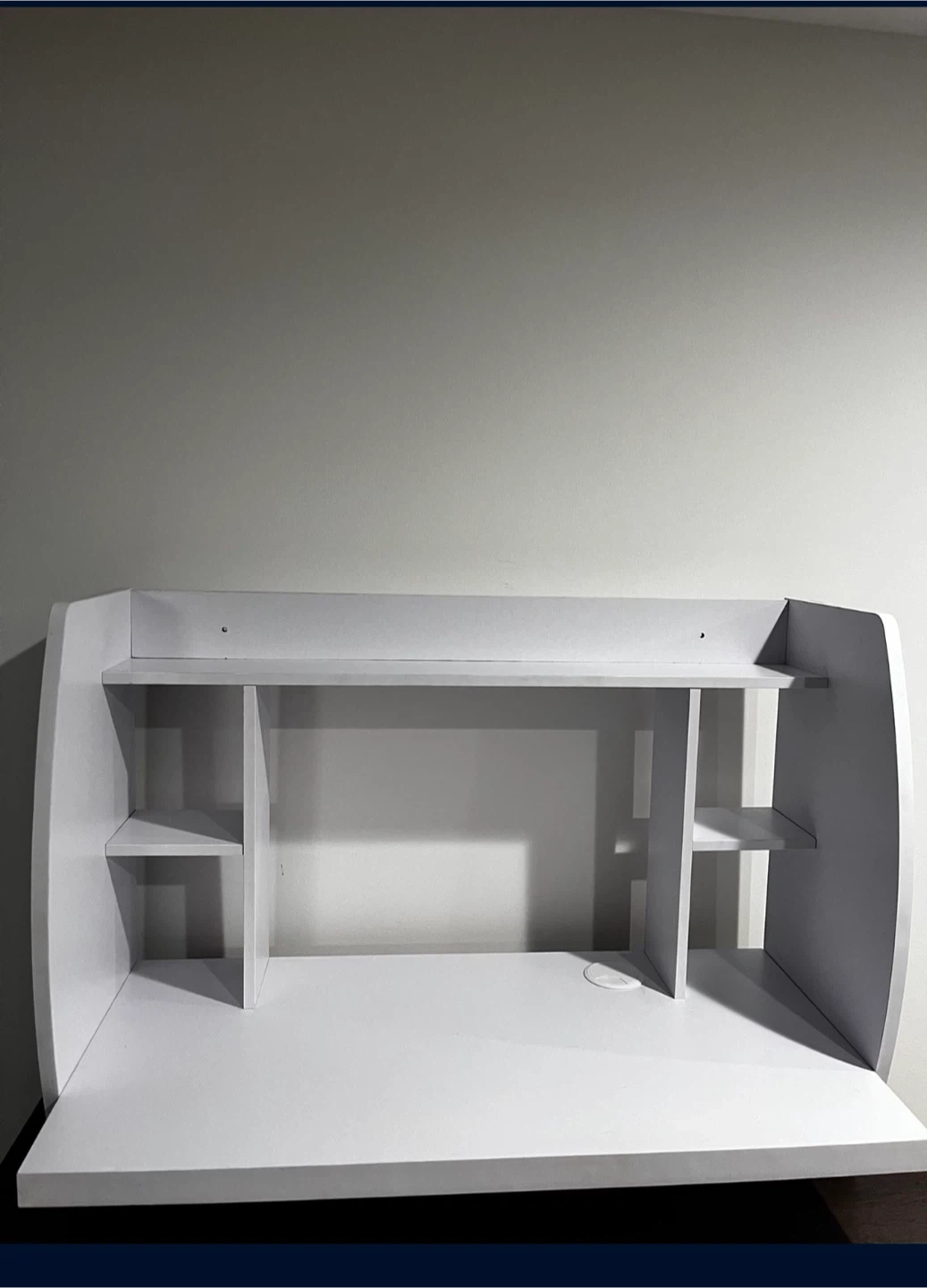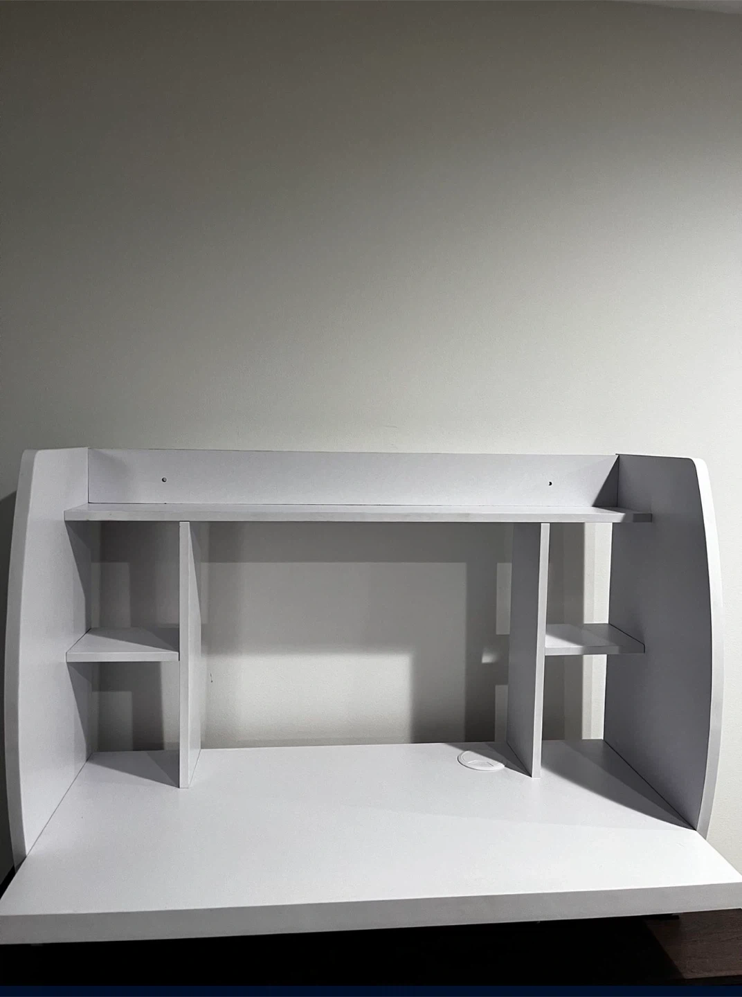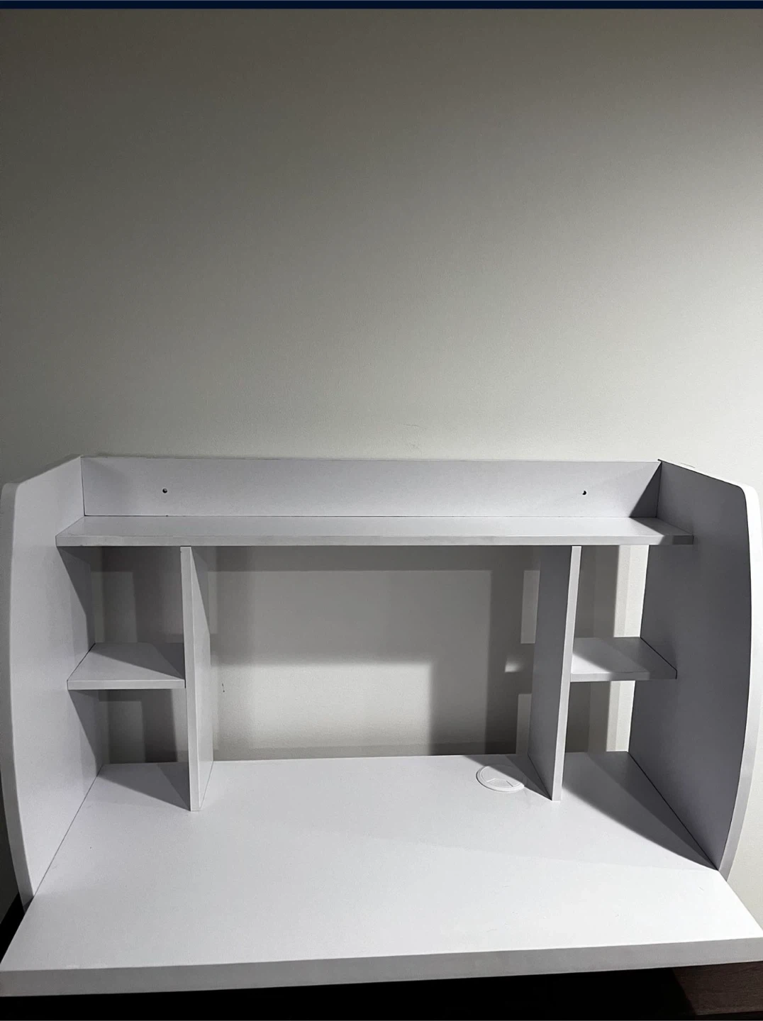 This white desk features an open shelving unit above the main desktop. It's great for organizing books or office supplies. The unit has a built-in cable management hole.