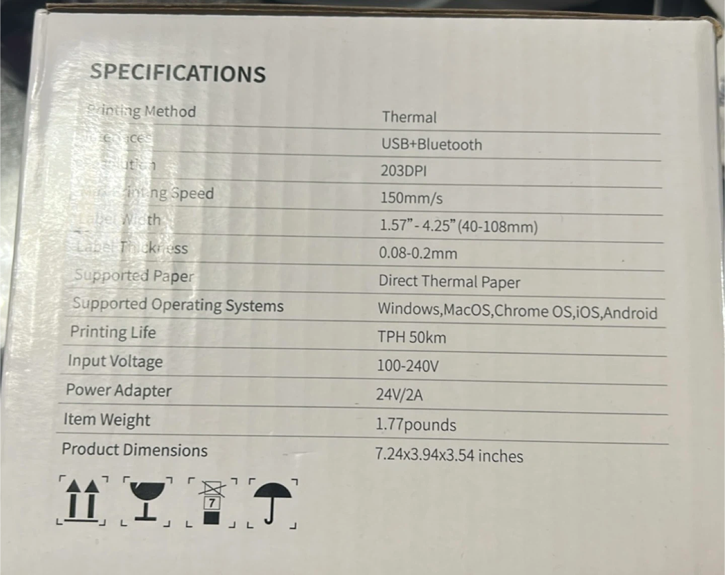 This thermal label printer uses USB+Bluetooth connectivity. It prints at 203DPI resolution and 150mm/s speed. Label width ranges from 1.57" to 4.25". Power adapter is 100-240V input, 24V/2A output. Item weight is 1.77 pounds.