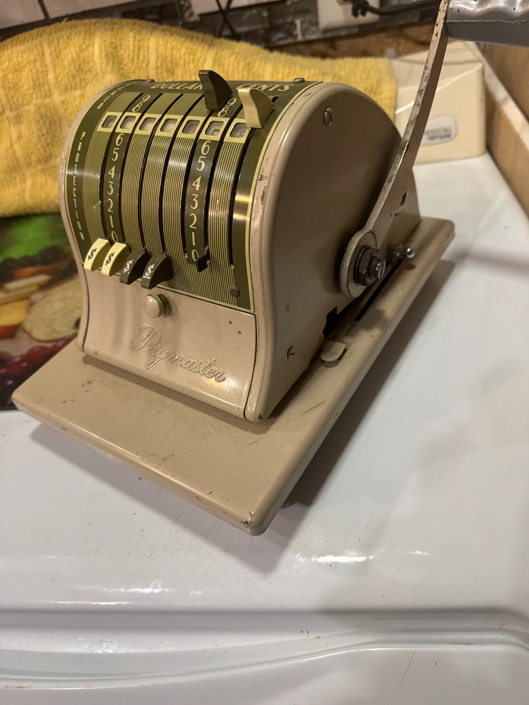 Selling a vintage Paymaster Series 9000 check writer. This vintage piece is in good condition and ready to add a touch of nostalgia to your space or collection, excellent paper weight !It all metal & has a beige color.