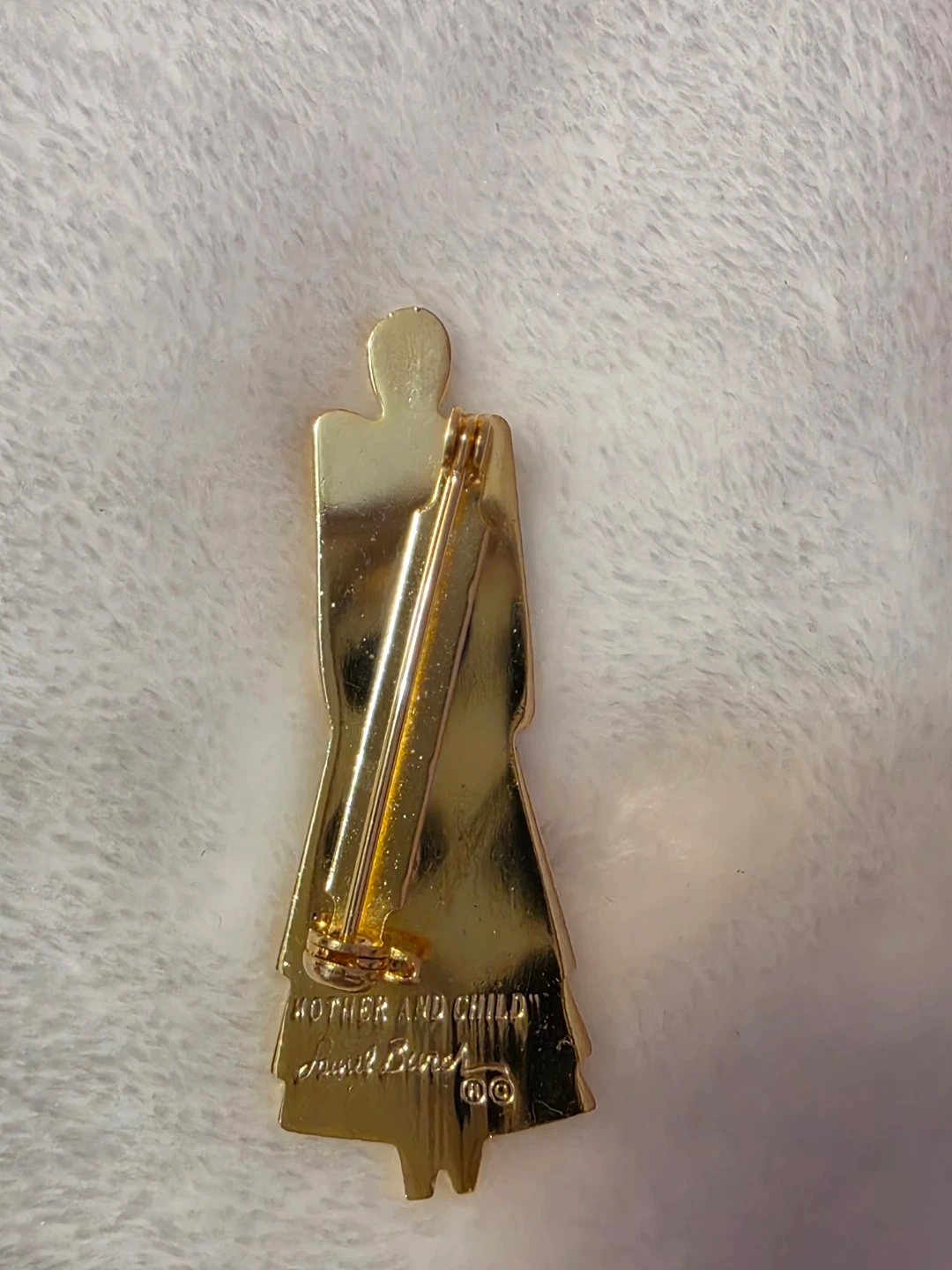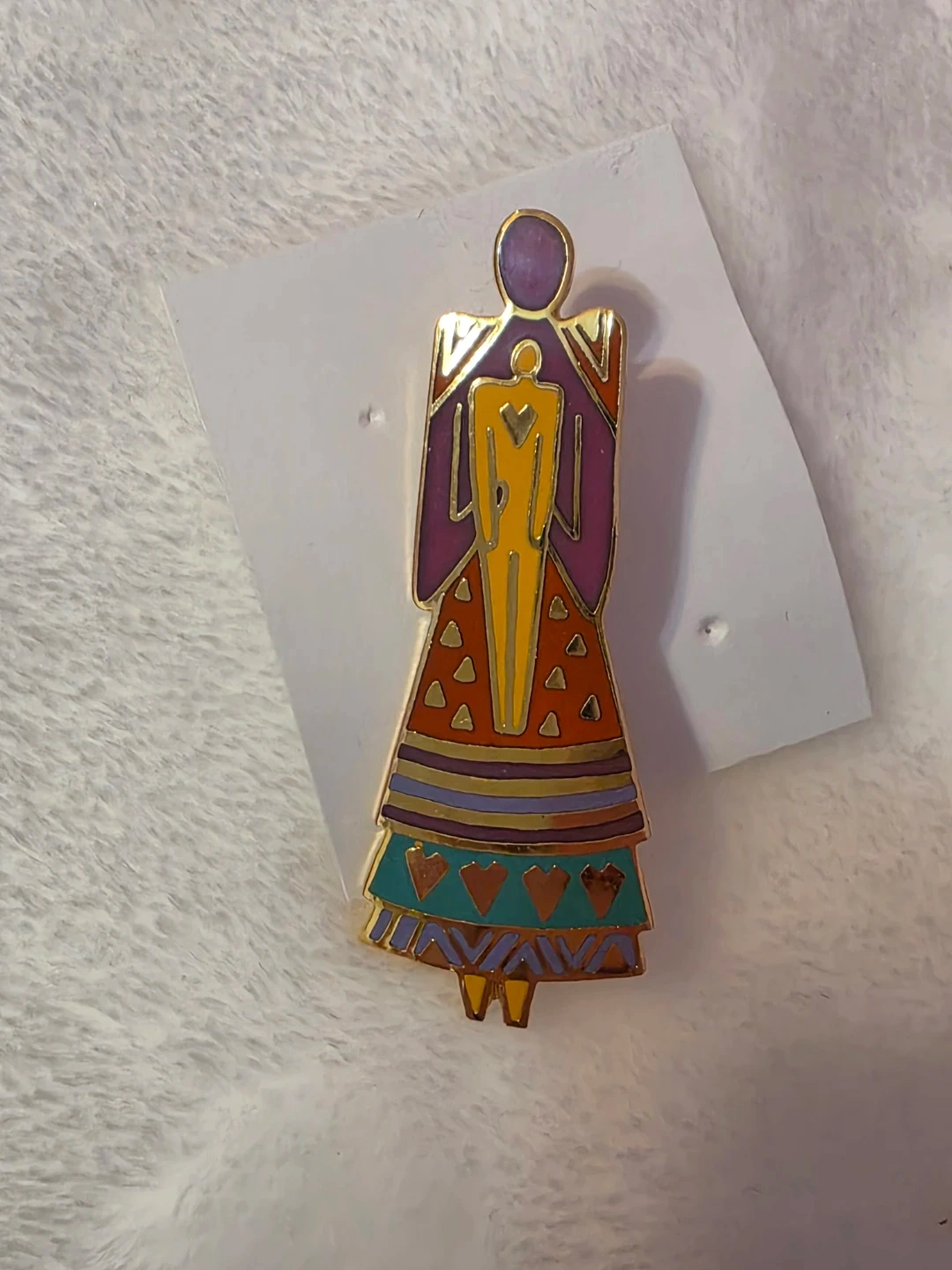 This vintage-style enamel pin depicts a mother and child figure. It's gold-toned with vibrant enamel colors in red, purple, yellow, and teal. The back has a secure clasp closure. A lovely piece for collectors or as a gift!