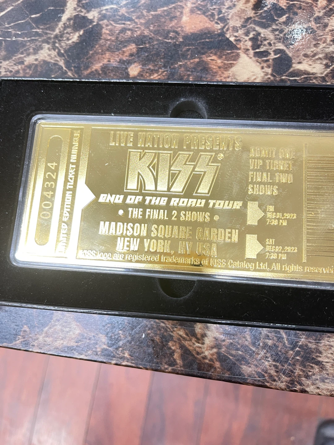 This is a limited production collectible 24K gold plated ticket from the KISS End of the Road Tour. It's a certificate of authenticity guaranteeing the item is for fans attending the final two shows at Madison Square Garden, New York. The ticket itself lists DEC 01, 2023 and DEC 02, 2023 as show dates.
