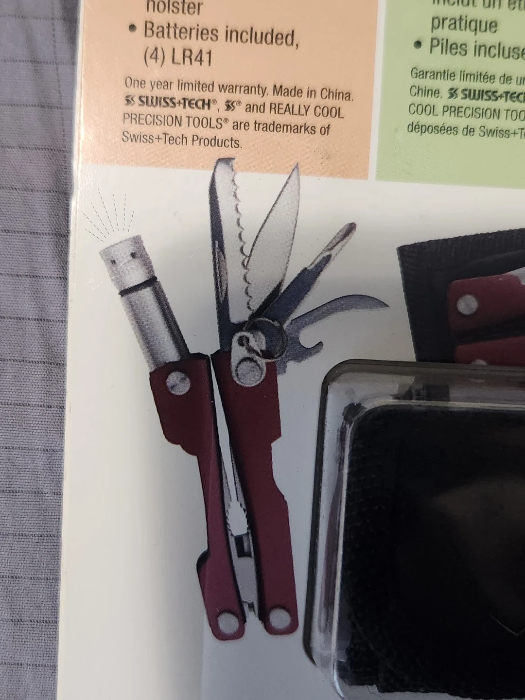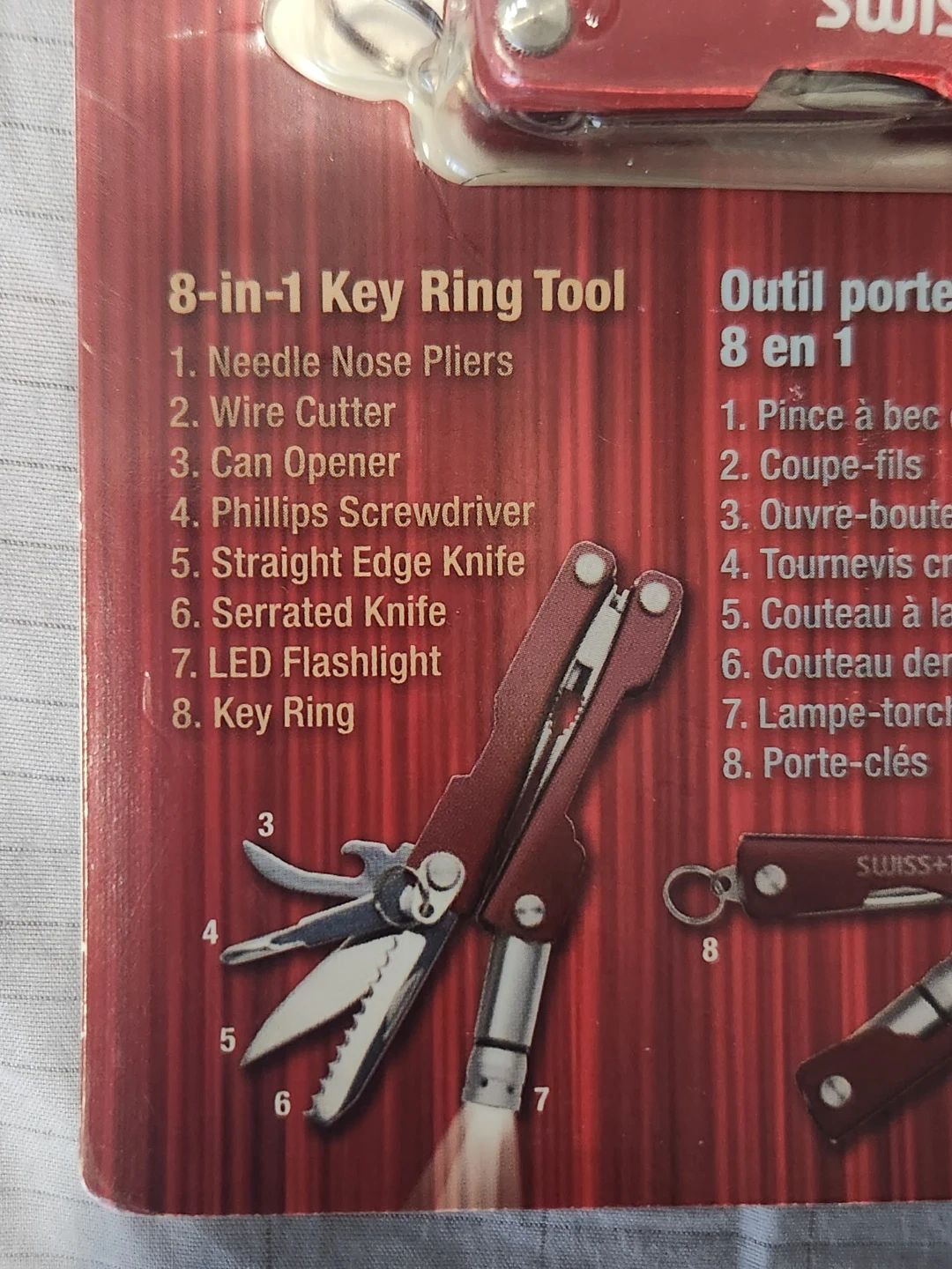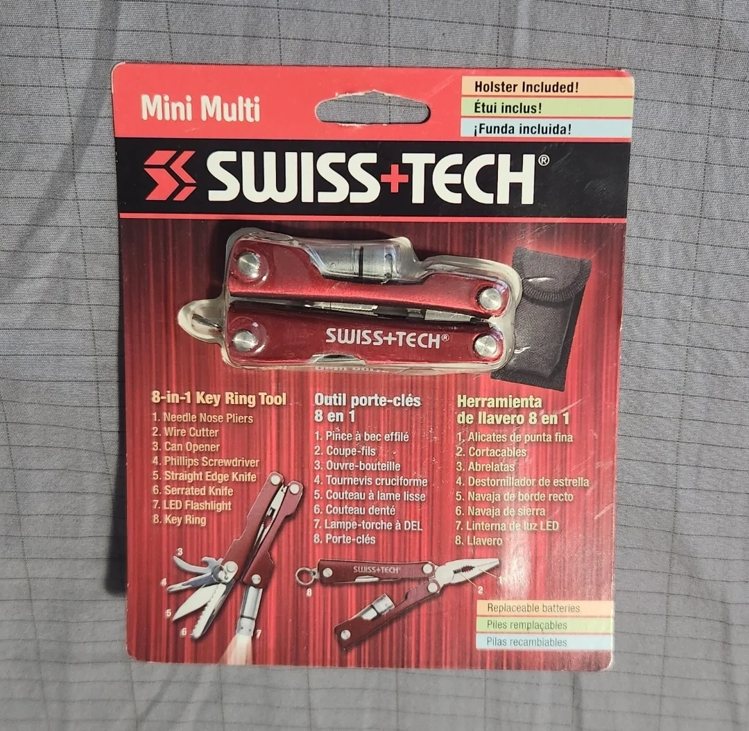 This SWISS+TECH 8-in-1 Mini Multi Tool includes needle nose pliers, wire cutter, can opener, Phillips screwdriver, straight edge knife, serrated knife, LED flashlight, and key ring. Batteries are included for the flashlight. A holster is also included!