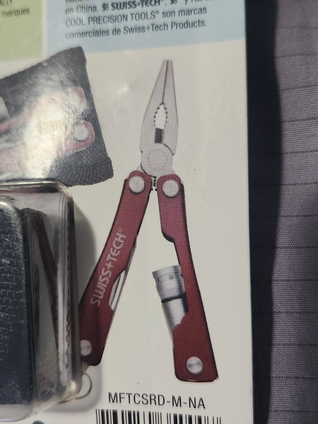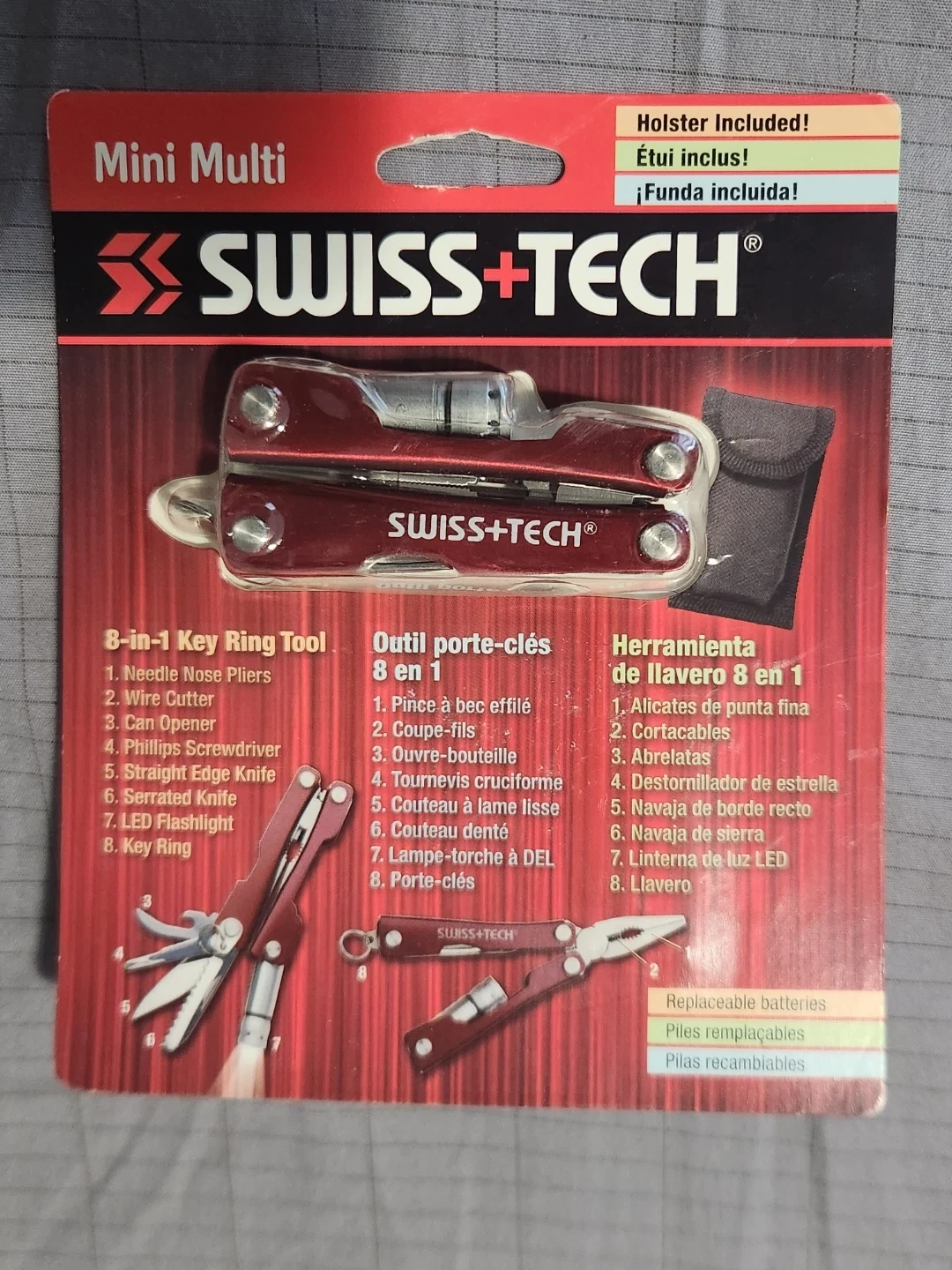 This SWISS+TECH 8-in-1 Mini Multi Tool includes needle nose pliers, wire cutter, can opener, Phillips screwdriver, straight edge knife, serrated knife, LED flashlight, and key ring. Batteries are included for the flashlight. A holster is also included!